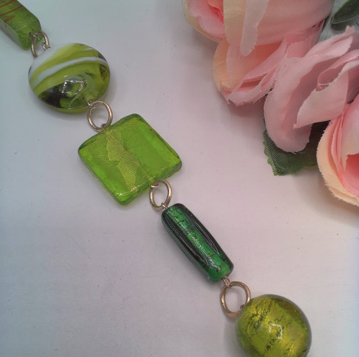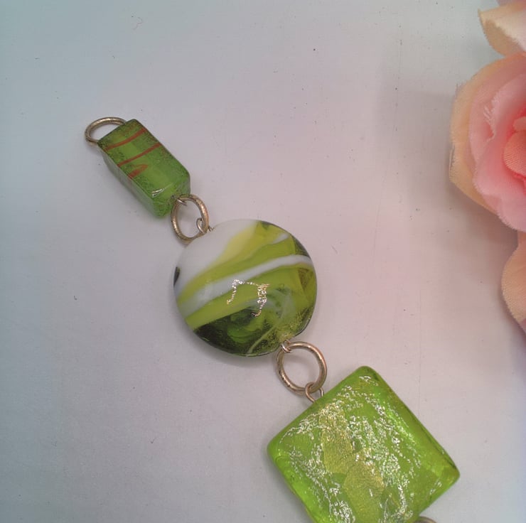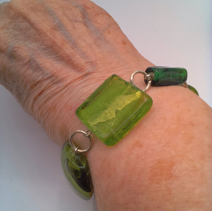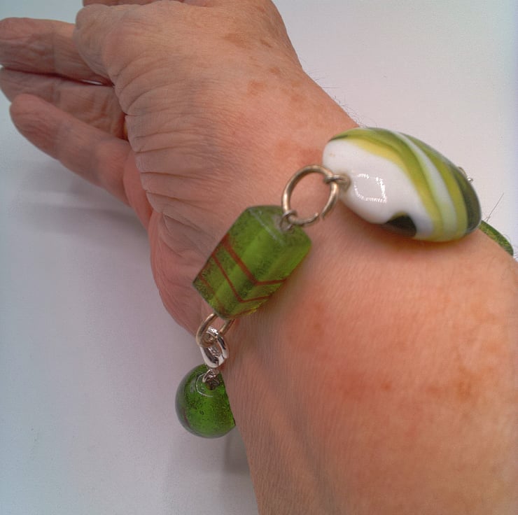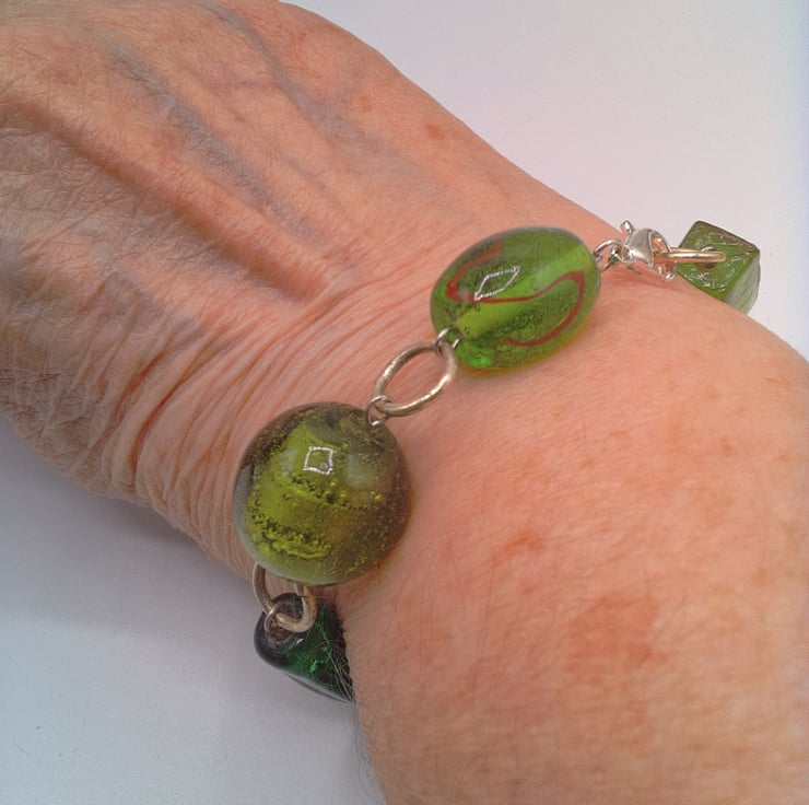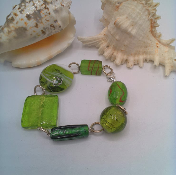 This very pretty different shades of green lampwork bead bracelet would look great with any outfit that you wear everyday for work or for a casual party or evening out. It would also make an ideal gift for a special lady for a birthday or anniversary, or as a lovely treat for yourself. The bracelet is made using a 20 mm x 12 mm puffed oval green glass lampwork bead, a 15 mm green round bead, a 28 x 12 mm long cubed green glass bead, a 25 mm green square bead, a 305 mm green and white lampwork disc bead and an 20 x 10 mm green elongated cube lampwork bead . The beads are joined together by rings and it is fastened with a silver plated lobster clasp. The bracelet measures 8.25 inches (21 cm) but the length can be altered to your required length. If you do require an alteration then please send me a message when you order. The bracelet will be dispatched wrapped in tissue paper in an organza bag and delivered to you via Royal Mail first class post.