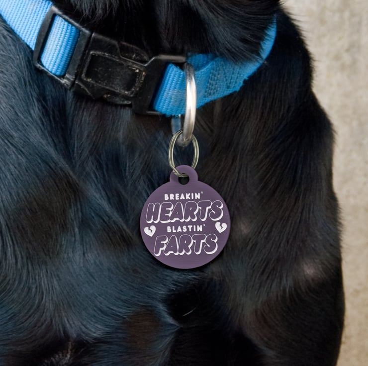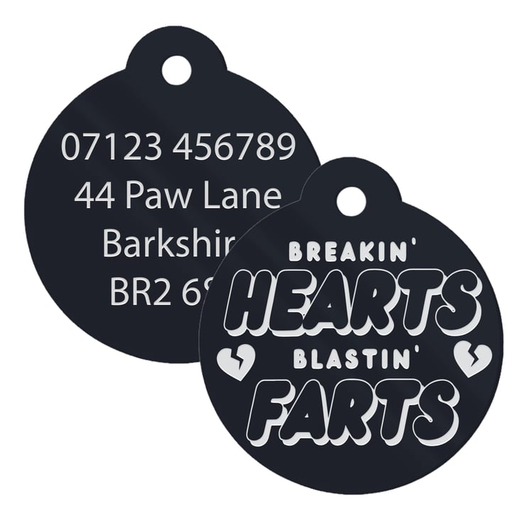 Give your furry friend a hilarious and stylish accessory with our coloured metal round dog tag that reads "Breakin' Hearts, Blastin' Farts." Perfect for pet owners who love to showcase their pet's playful personality, this custom pet ID tag is both functional and fun. Made from durable metal and available in various vibrant colours, this tag is sure to make your pet stand out.