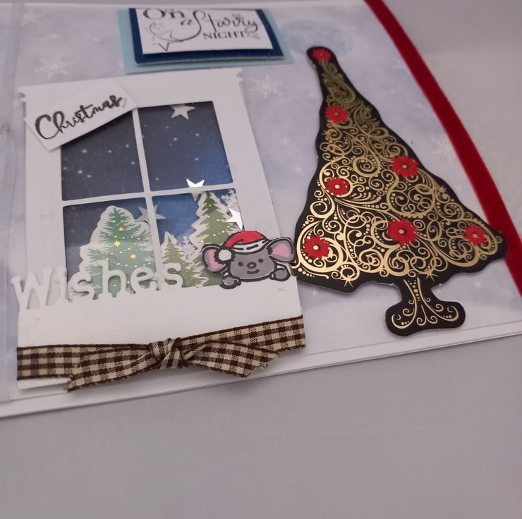 This is a large sized card which has been embellished usingco-ordinating cardstock and ribbon. A mouse is perched by the shaker window and the card is completed with a black, red and gold Christmas tree. The wording 'On a Starry Night' finishes the design. This card measures 8 inches square. The inside is lined with co-ordinating paper which has been left blank for your own message.