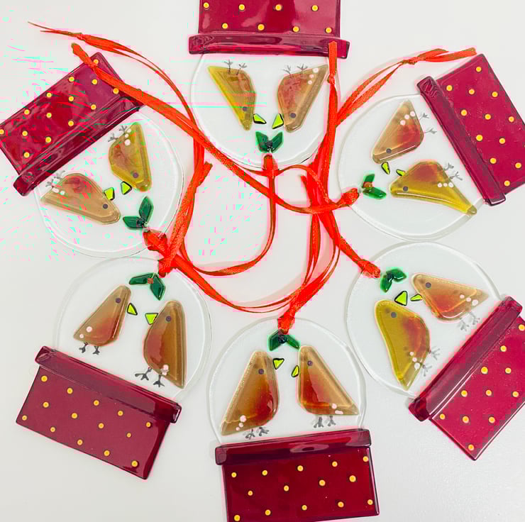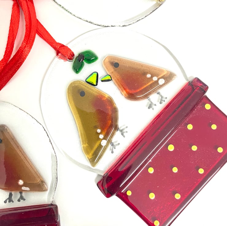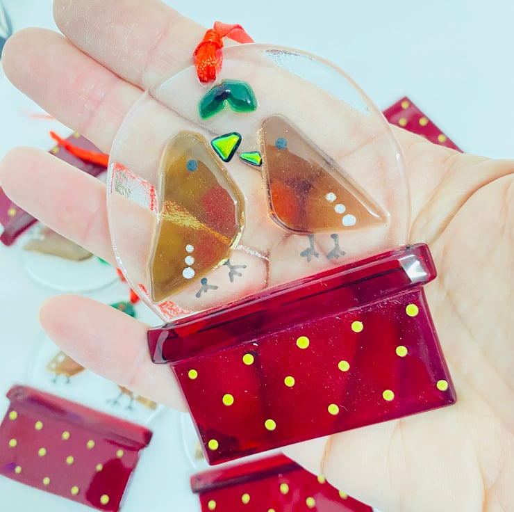Cute robin pain in a snowglobe shape design. The robins beaks are made using gold dichroic glass. . The robins are contoured and super shiny - created from brown transparent glass and red powdered glass . The base of the snowglobe is also transparent glass . The fused glass ornament is created in the kiln over 24hrs and is then drilled and ribboned .