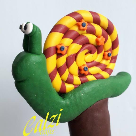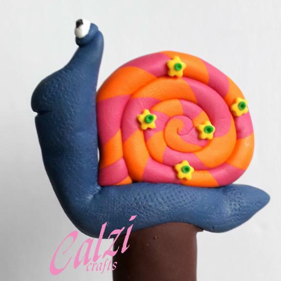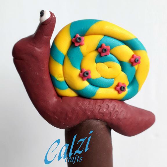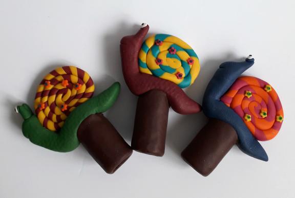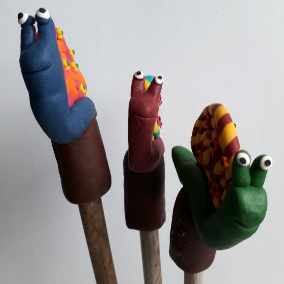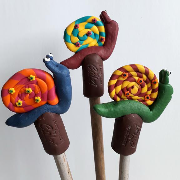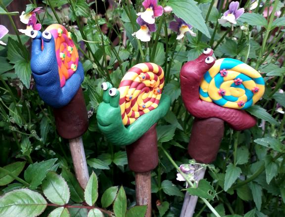 This set of three garden cane toppers in the form of snails with colourful spiral shells, has been made with polymer clay which is waterproof and durable for outside and will last many years