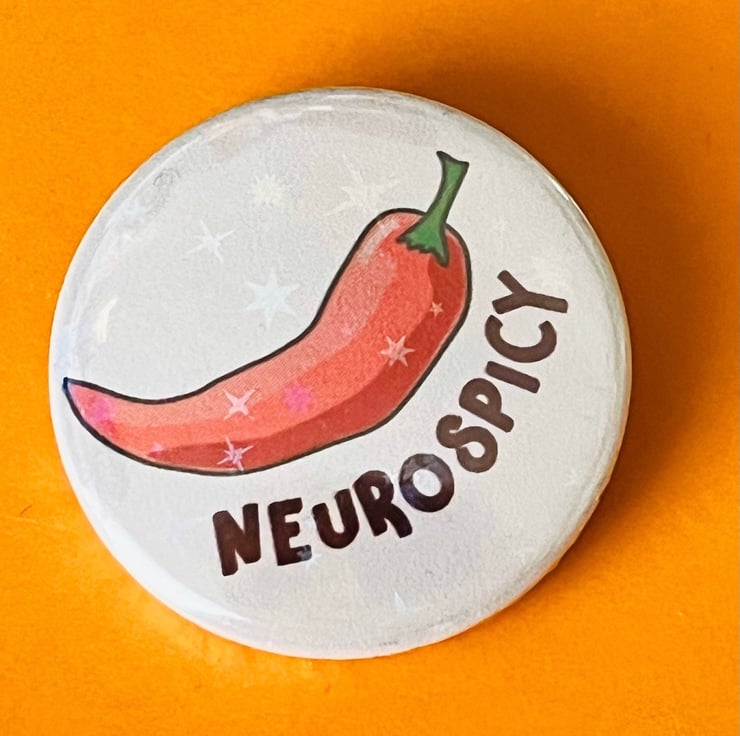 Neurospicies unite! The red chilli neurospicy badge is finally here! I ve been re-drawing this little chilli pepper for so long, because the perfectionism complex got me. But I finally like it enough to make it into a badge. And I think this badge is a perfect contender for a holographic star overlay to add a little extra spiciness. (If you d prefer one without the holo, just message me when you order)