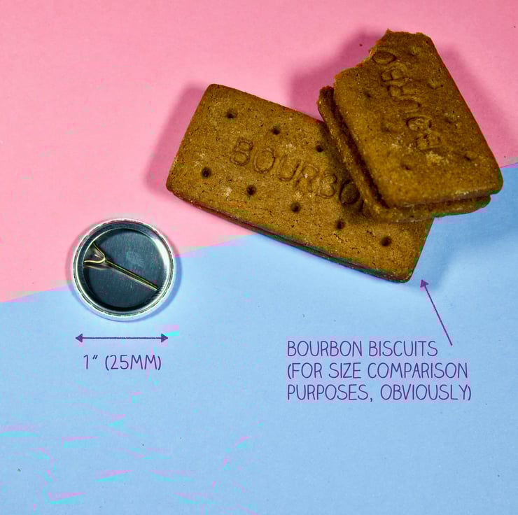 One awesome mini (really, it's not big, look at the photos, it is approximately A7 in size) card, blank inside for your own choice of words, with a removable mini 25mm (1") badge.