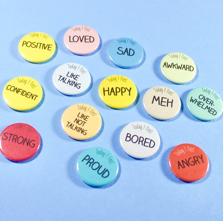 Ever wanted to tell people how you were feeling, but just didn't want to do the talking? Use these squirkly communication aids as badges or fridge magnets to let people know how you are feeling. Buy just one badge, or buy a set to communicate all the emotions. Custom wording and colours welcome, just drop me a message and we'll work on it together.