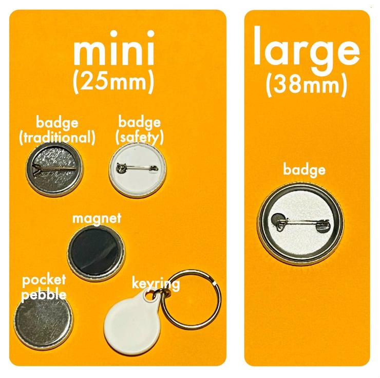 One awesome badge (or pocket pebble, magnet or keyring) in the size of your choice, with a mylar covering.