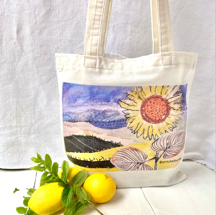 Made with 100% repurposed cotton fabric. The art print on the front is my embroidered sunflower collage.