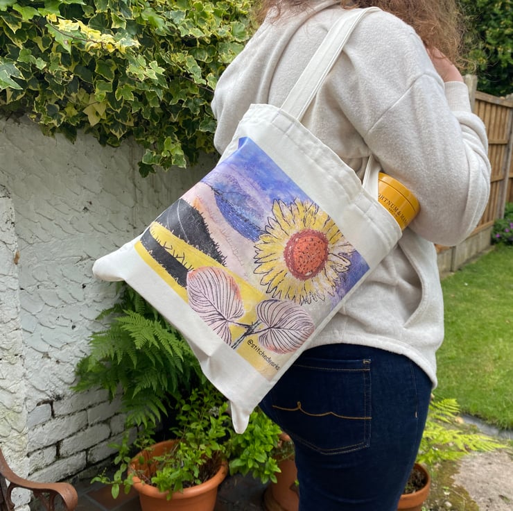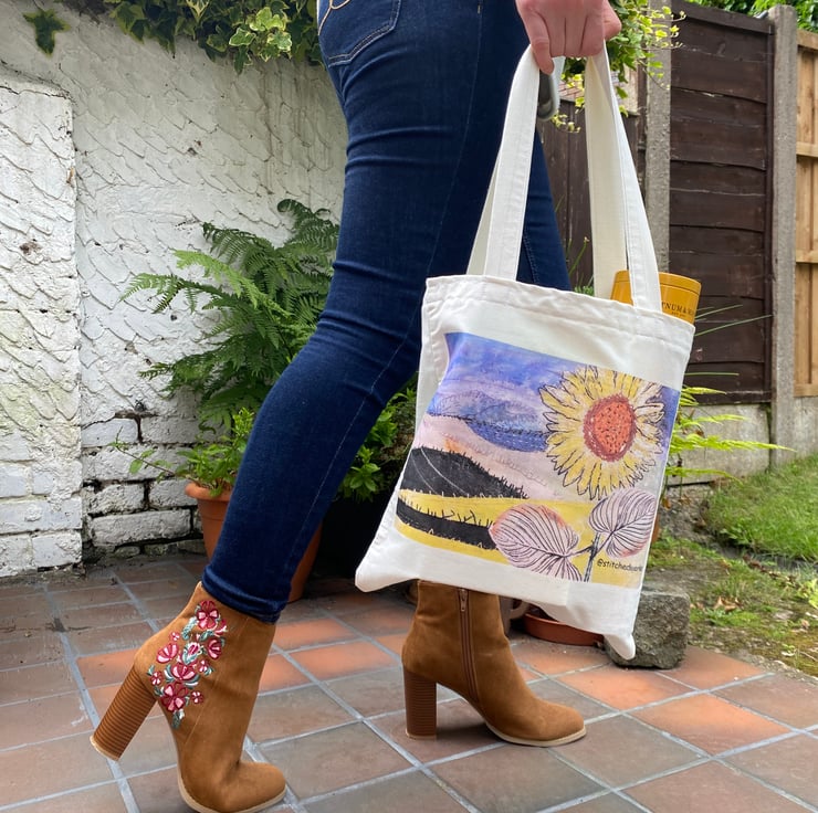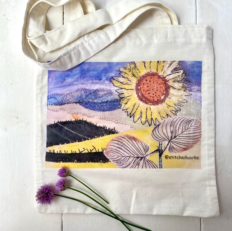Made with 100% repurposed cotton fabric. The art print on the front is my embroidered sunflower collage.