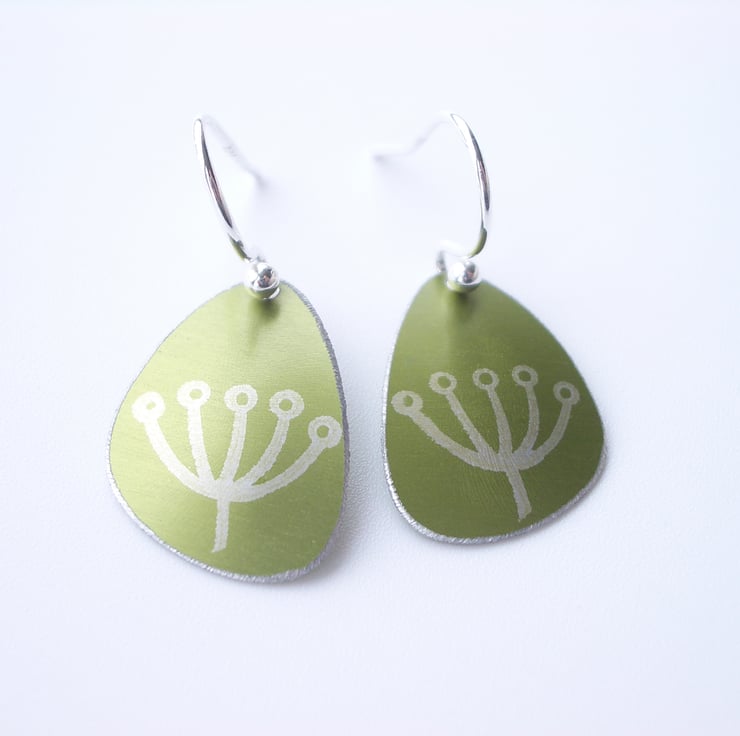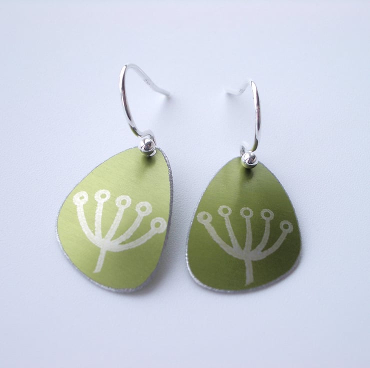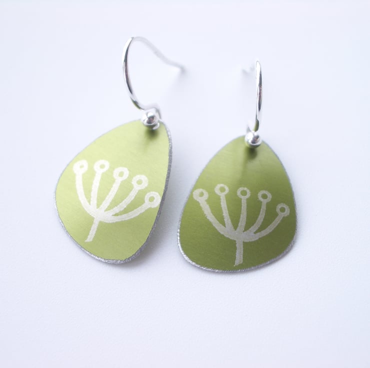 These green teardrop shaped earrings are made from aluminium which I have dyed a fresh lime green and printed with a silvery white cow parsley print. The dye is made permanent through heat and becomes a part of the metal. I saw pierce the oval shape by hand and finish by doming and filing the edges. The earrings hang from sterling silver ear hooks and measure approximately 20mm x 14mm.