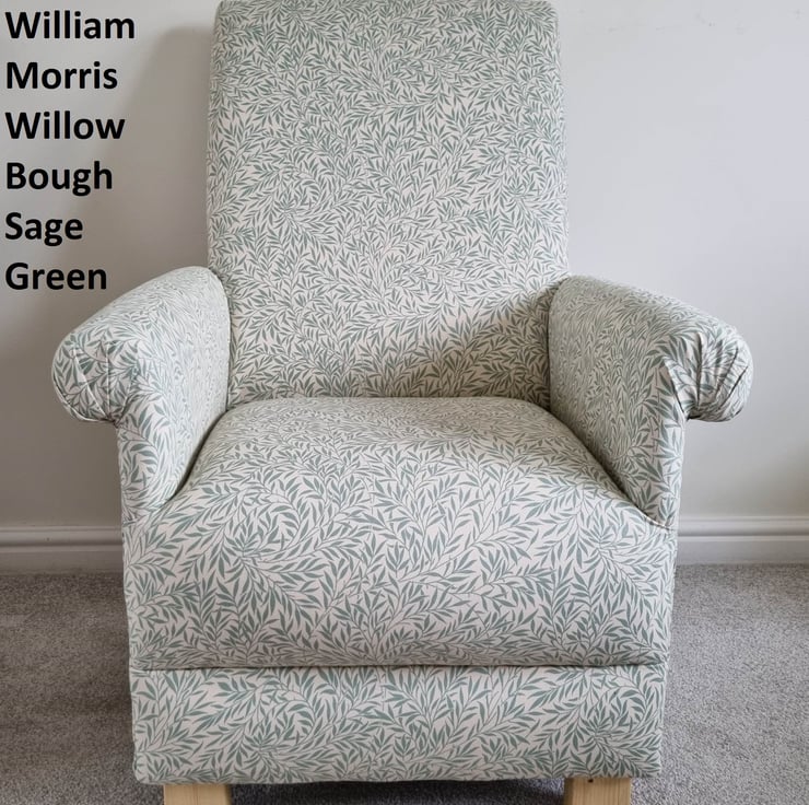 This is a handcrafted, sturdy Adult chair & footstool, which has been made by myself, a professional upholsterer with over 32 years experience, using this lovely William Morris Willow Bough Sage Green fabric, and also includes a matching footstool.