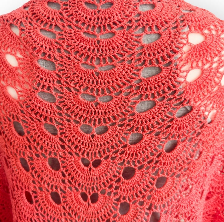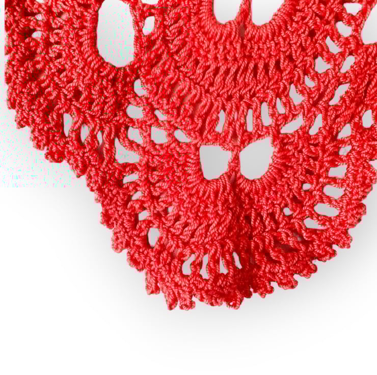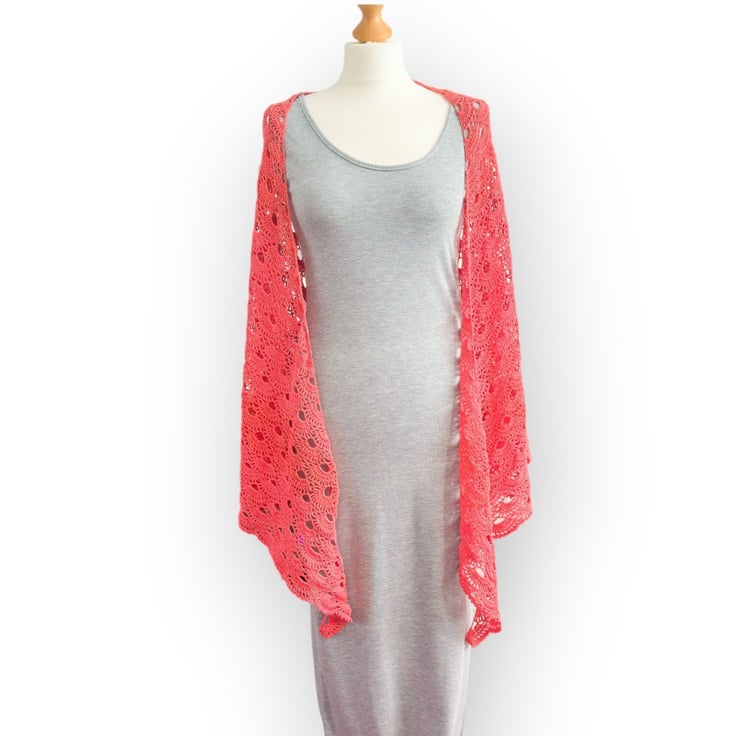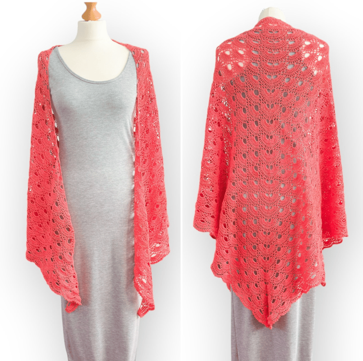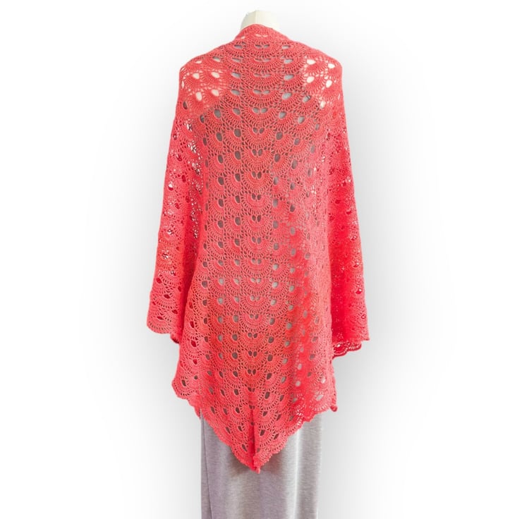 This shawl evokes the charm of a family heirloom passed down through generations—like something lovingly crocheted by a great-great-grandmother—but with a fresh, modern twist thanks to its bold, bright colour.