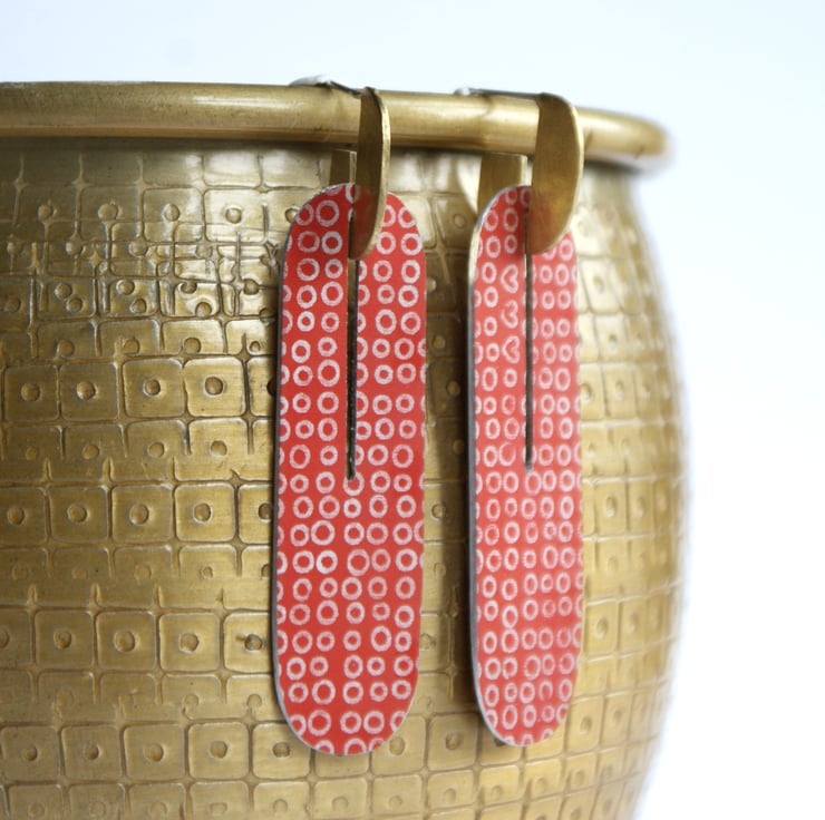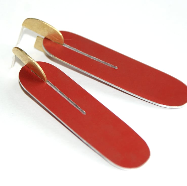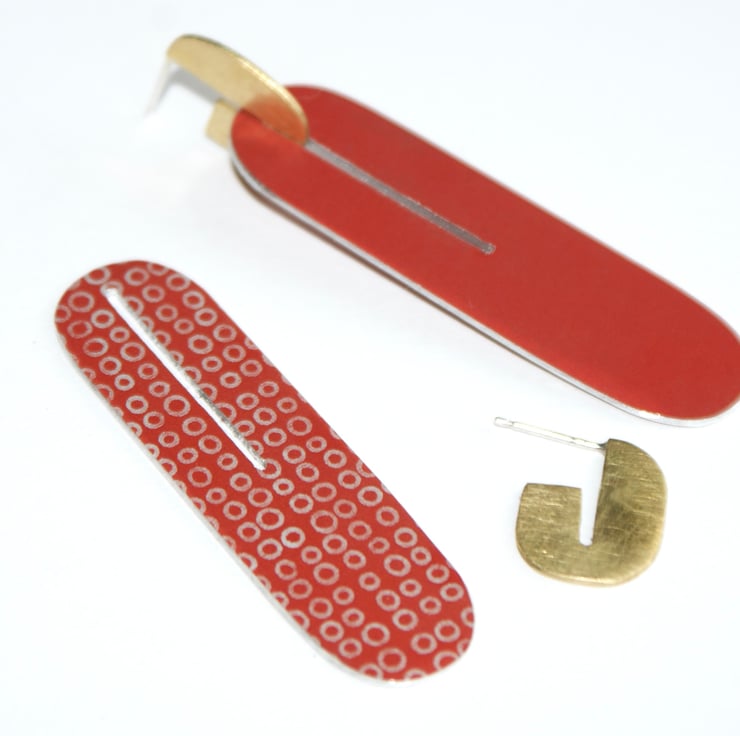 Make a statement in these long red earrings made from hand dyed anodised aluminium and brass. The brass stud part has a sterling silver ear post and the brass has been given a matt satin finish fitting together with the red part with a narrow slot. The red part is plain on one side and has my circle pattern on the other so can be worn either way around. The brass part can also be worn on its own.