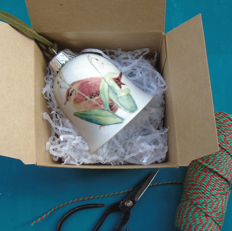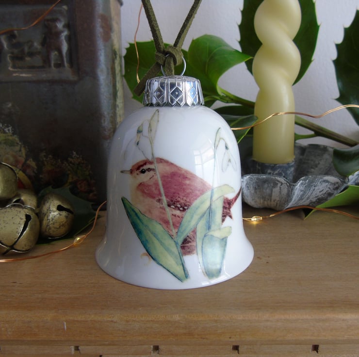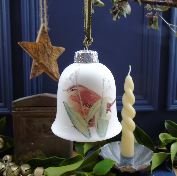 A delicate fine bone china decorative bell featuring my watercolour painting of a tiny wren peeping through the snowdrops, a charming Christmas decoration for British bird lovers.