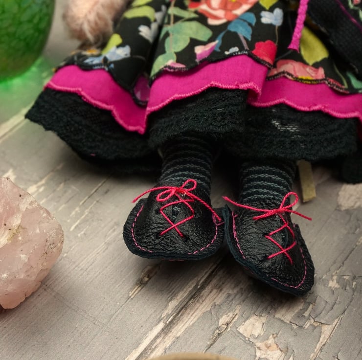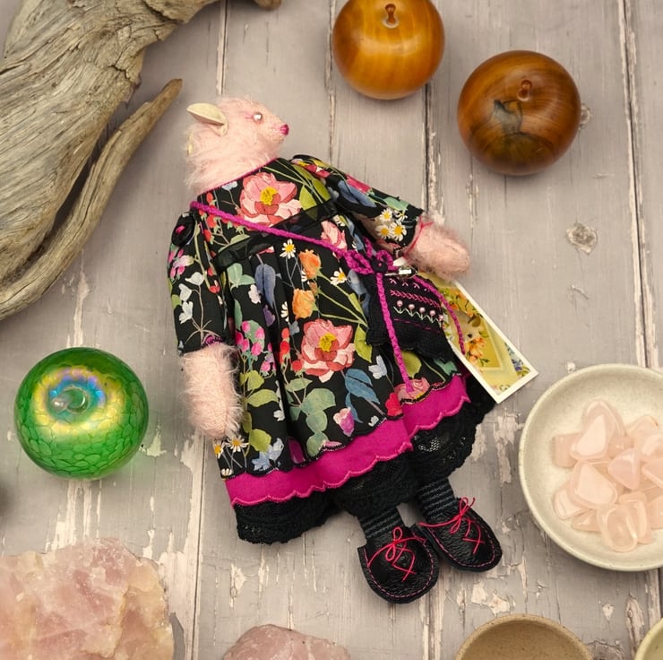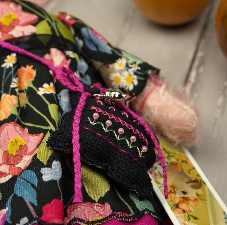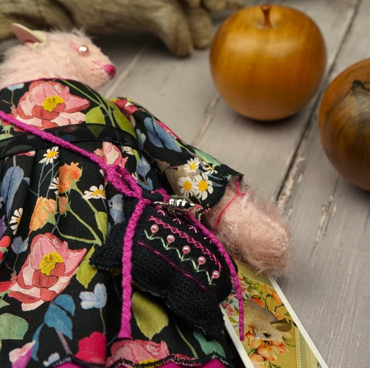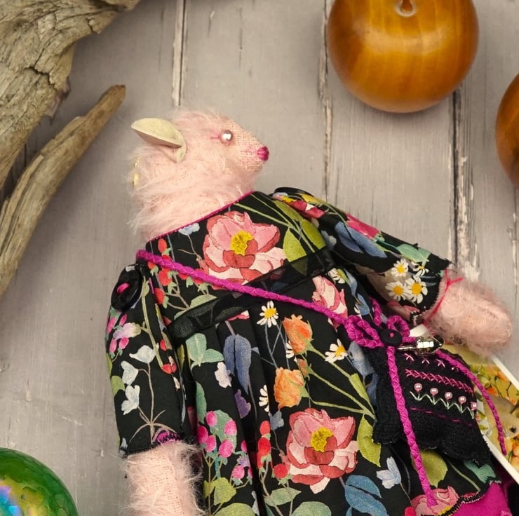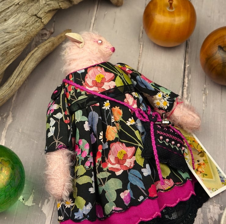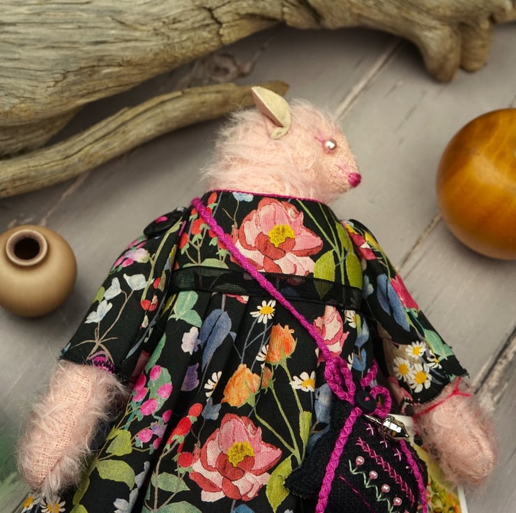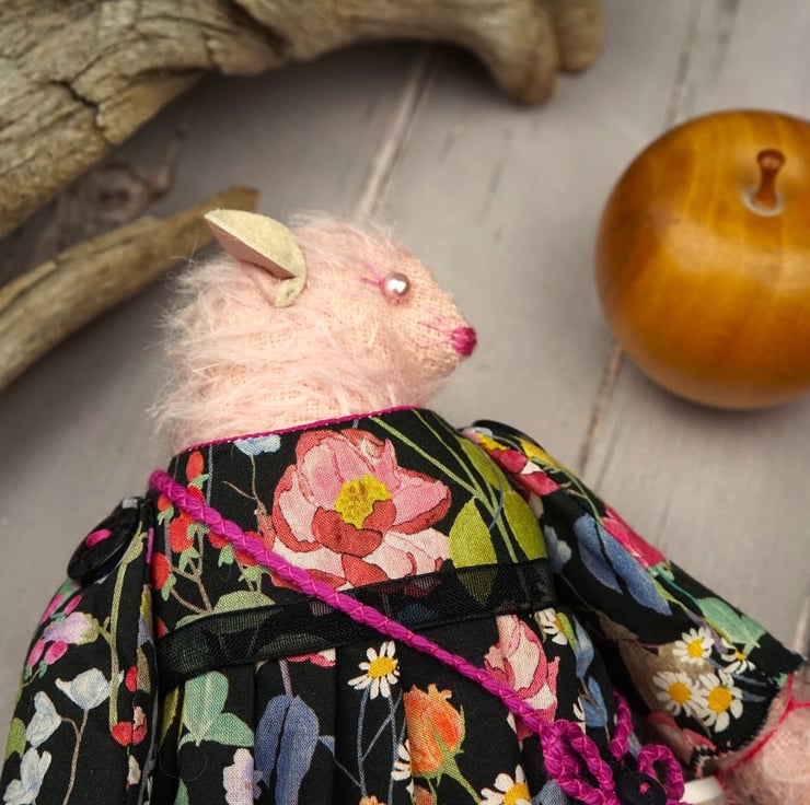 This is Amice, a tiny midnight mohair mouse. She is a hand embroidered mouse with little leather ears and tail. She is dressed in a Liberty tana lawn called Fairytale Forest, the midnight version, a black ground with a riot of colourful wild flowers She has coordinating underskirts in cerise tana lawn, black tulle mesh and white cotton lace bloomers. Her dress is finished with organza ribbon, tiny buttons and little leather shoes. She is a pale pink mohair mouse with pink ears and tail, pink whiskers and an embroidered pink nose. Her pearl bead eye is a pale pink.