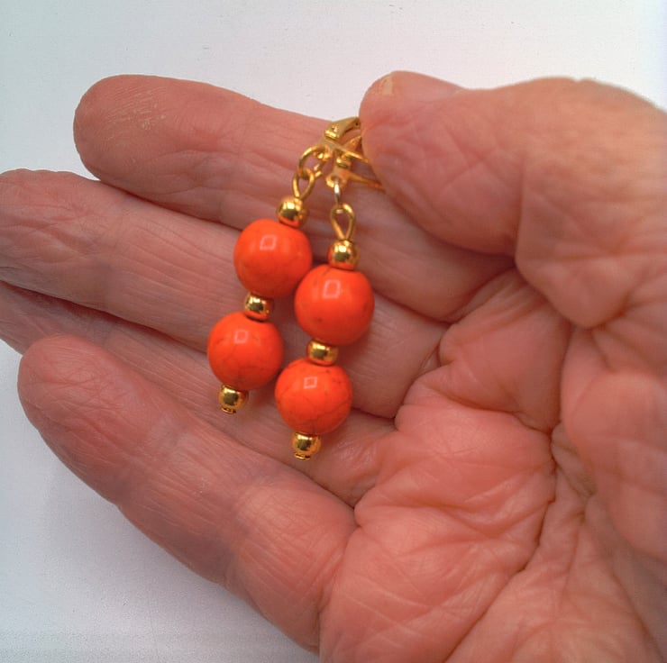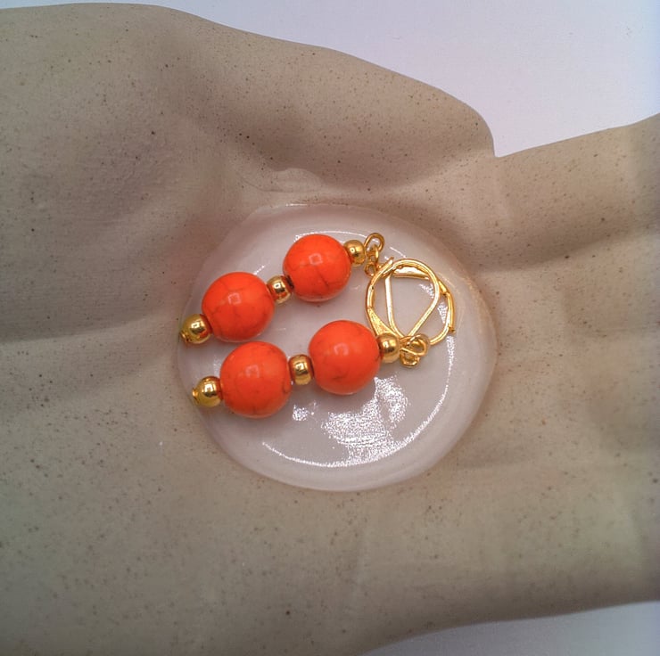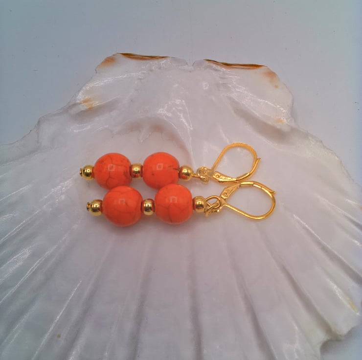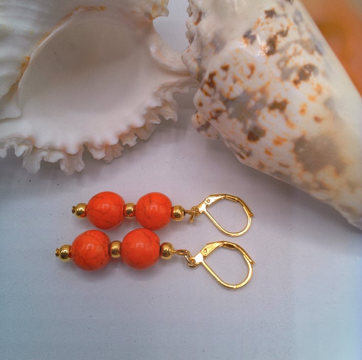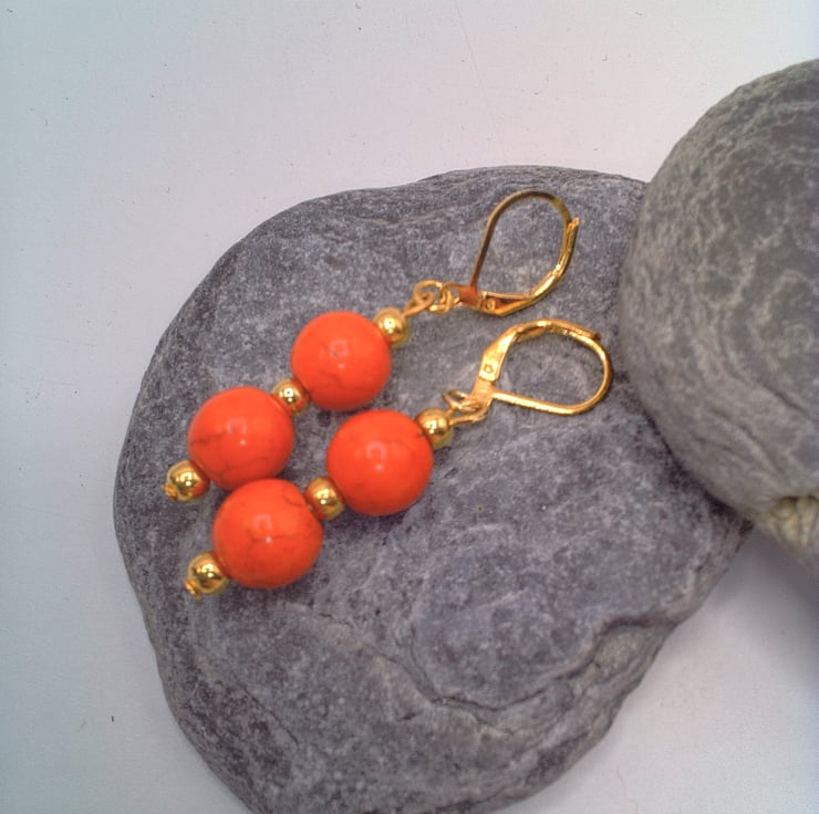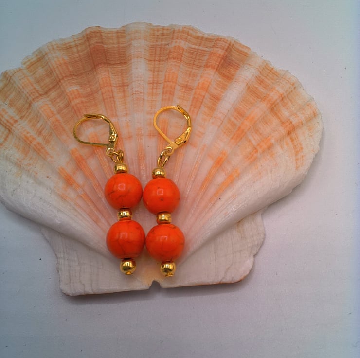 These bright and colourful earrings would go well with any outfit you choose to wear everyday or for an evening out. They would make the perfect gift for a friend or relative for a birthday or anniversary, or a lovely treat for yourself. They are made using 8 mm red/orange glass bead and 3 mm gold plated spacer beads, suspended on gold plated lever back ear wires with a drop of 3.5 cm from the base of the ear wire. The earrings will be dispatched wrapped in tissue paper in an organza bag an delivered to you via Royal Mail first class posts.