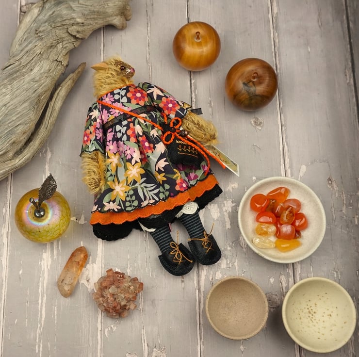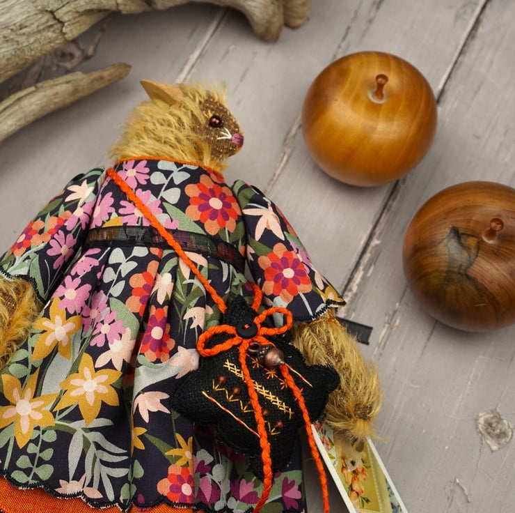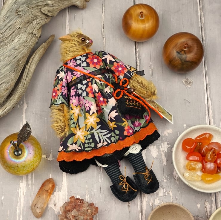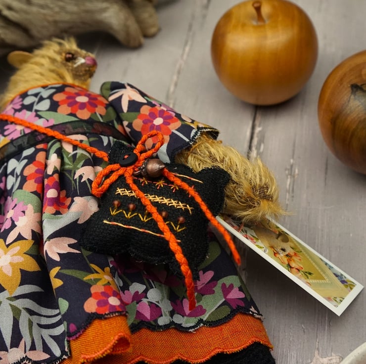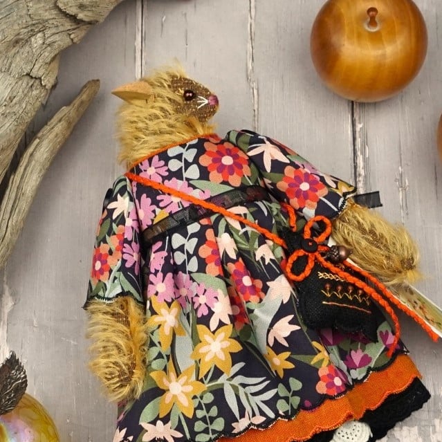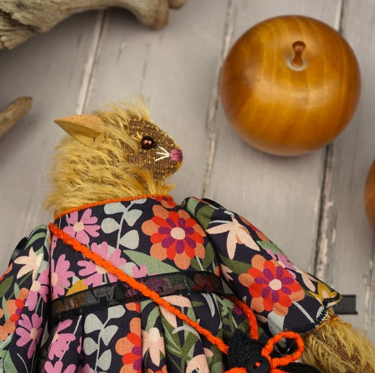 This is Esme, a tiny midnight mohair mouse. She is a hand embroidered mouse with little leather ears and tail. She is dressed in a Liberty Tana Lawn called Antonia Bloom, the midnight version, a black ground with a riot of wild flowers and blooms running across the fabric. She has coordinating underskirts in deep orange shot cotton, black tulle mesh and cream cotton lace bloomers. Her dress is finished with organza ribbon, tiny buttons and little leather shoes. She is a golden mohair mouse with brown ears and tail, white whiskers and an embroidered pink nose. Her pearl bead eye is a rich brown.