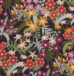 I love colour and I am particularly drawn to the delicate prints you can find in Liberty Tana Lawn and Cotton Poplin. However, sometimes I find myself attracted to less colourful prints and I buy them and never use them. So the midnight series was born, little creatures in blacks, browns and greys with dark prints that please me. Antonia Bloom is a favourite fabric of mine, several years old now but such wonderful vibrant colours. The golden brown of Esme's fur sits so well with this late summer print.