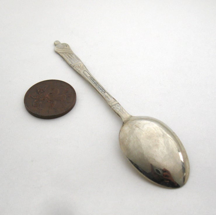 It's a small spoon approx. 4 1/4" (10.5cm) long. You will receive the spoon shown in the photos - I don't do digital mockups. Please note the spoons I use are vintage (or possibly antique) so they do show signs of age and wear. If signs of age and wear bother you, please do look elsewhere for your handstamped cutlery; there are plenty of shops out there stamping on mint condition silverware. Personally I like things with a bit of character and history. These grumpy old guys have been around a bit... who knows how many cups of coffee they've stirred in their long life?