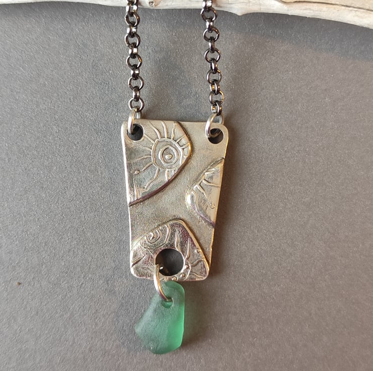 White bronze and seaglass metal clay pendant, 5cms long from chain to tip. 75 cm gunmetal nickel free belcher chain.