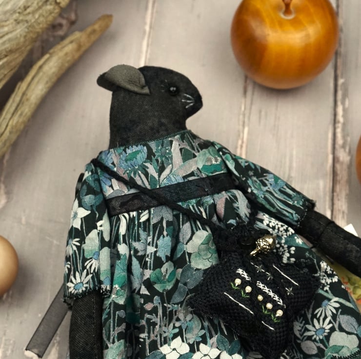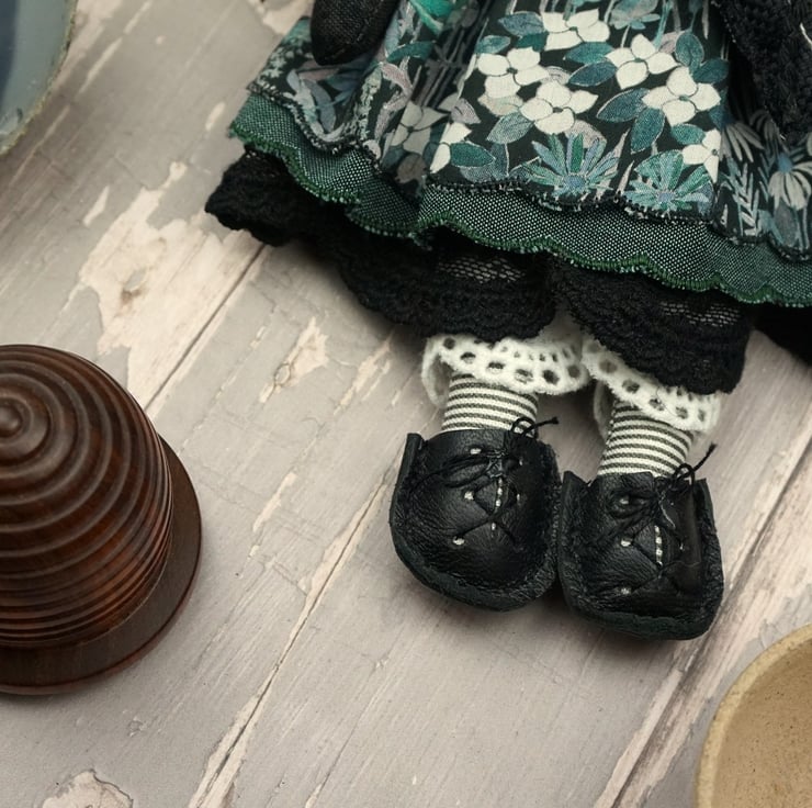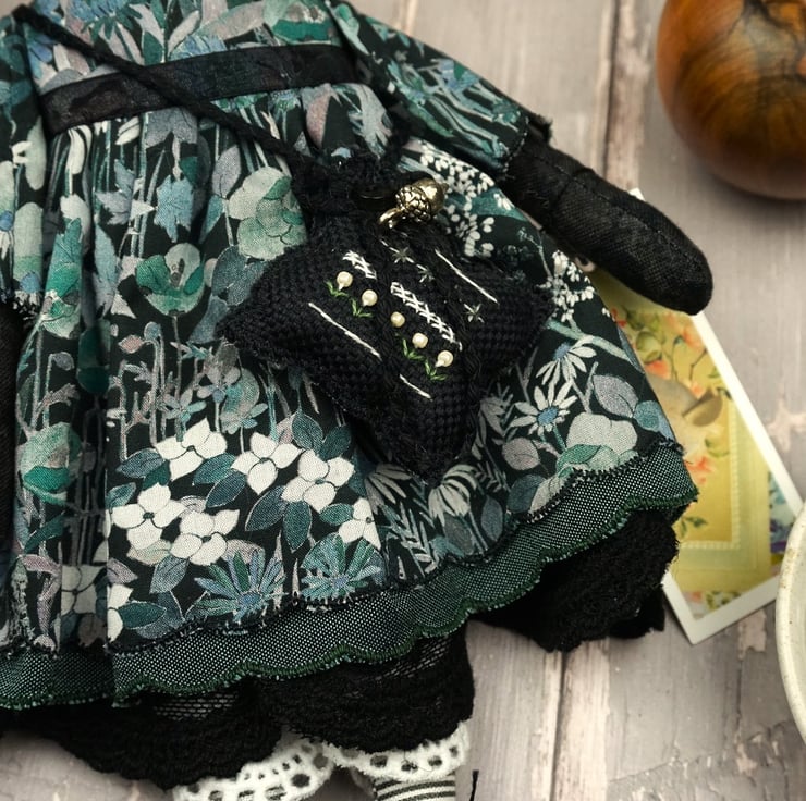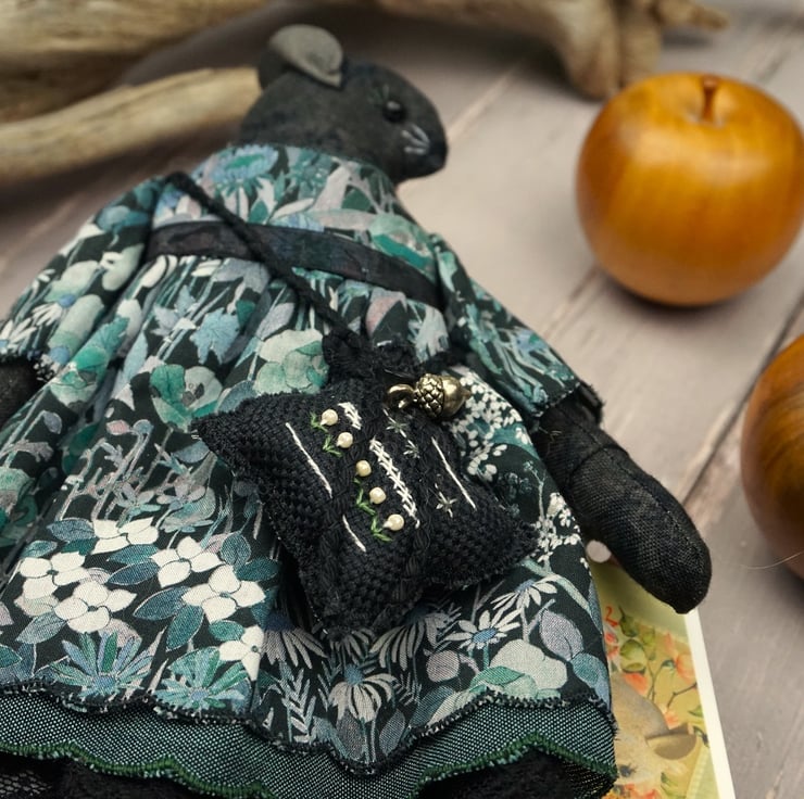 This is Faria, a tiny midnight mouse. She is a hand embroidered mouse with little leather ears and tail. She is dressed in a Liberty tana lawn cotton called Faria Flowers, the midnight version, a black ground with pencil crayon wild flowers in grey and mineral green. She has coordinating underskirts in mineral green shot cotton, black tulle mesh and white cotton lace bloomers. Her dress is finished with organza ribbon, tiny buttons and little leather shoes. She is a black mouse with black ears and tail, grey whiskers and an embroidered black nose.
