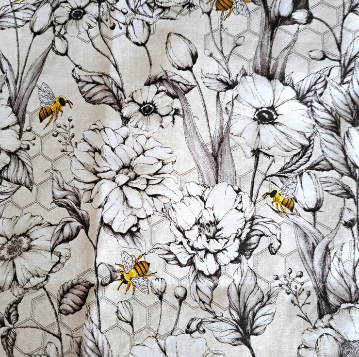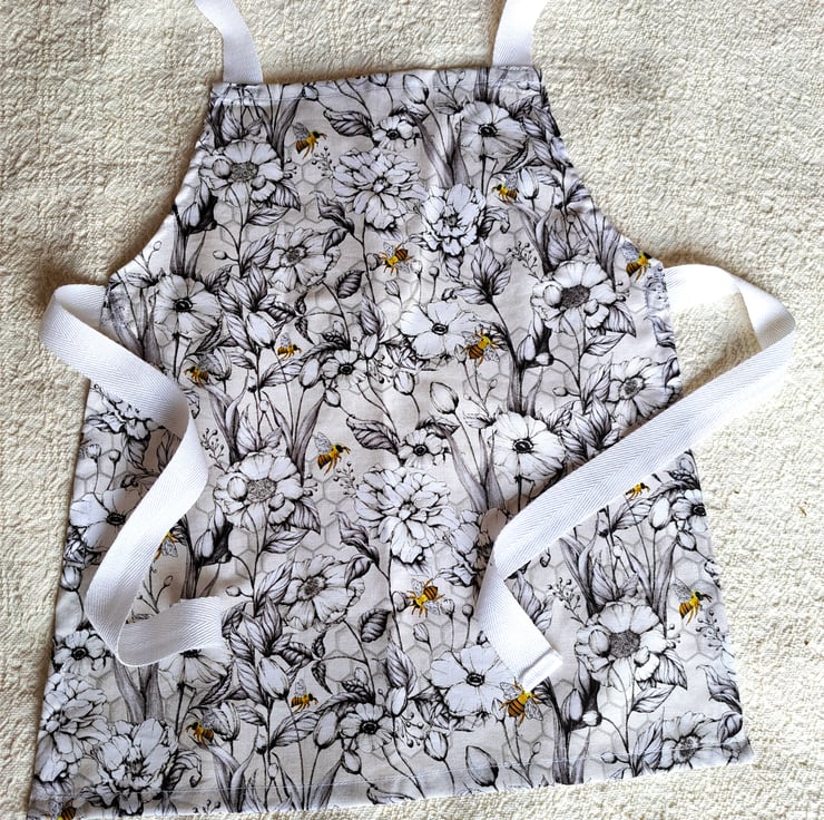This lovely little apron has bright yellow life-size bees against an all off-white background with printed black line drawings of flowers and honeycomb. It is made of good quality quilting cotton, which is machine washable. The straps are acrylic herringbone. The apron is 17" (43cm.) from neck to hem and 15" (38cm.) at its widest point, and will fit a child between two and six approximately.