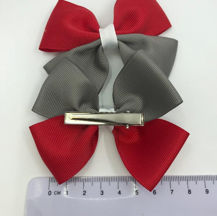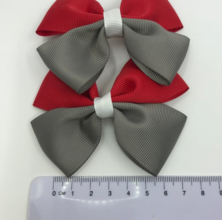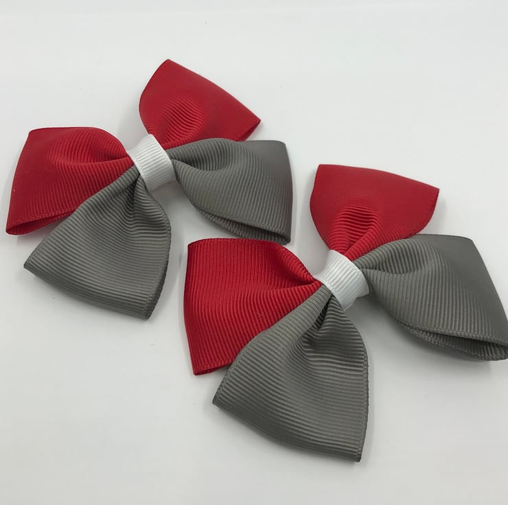 Our two tone double bows are handmade here in our little shop. They are made from the best quality Grosgrain ribbon. These bows are simple and classic and look extremely smart and go well with the red, grey and white School Uniform.