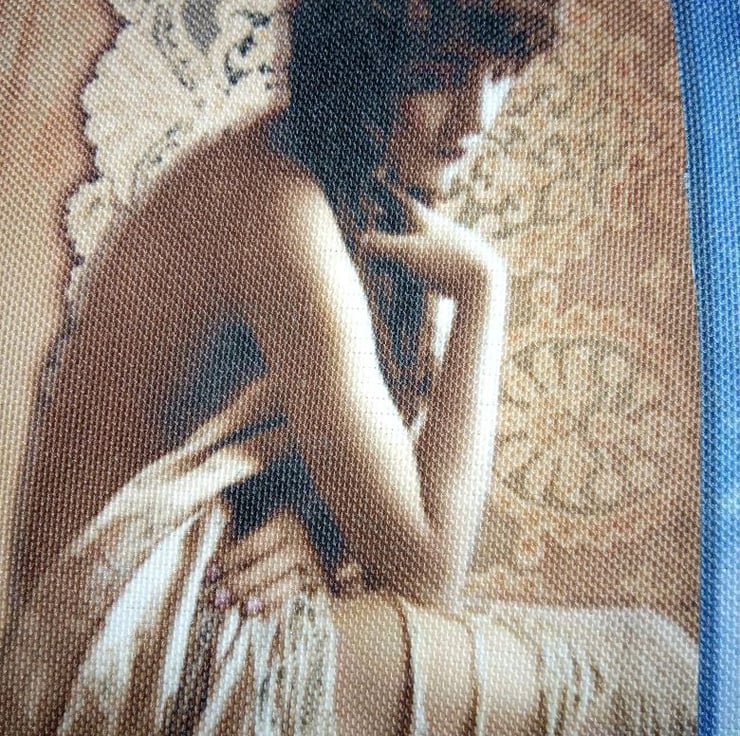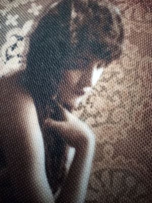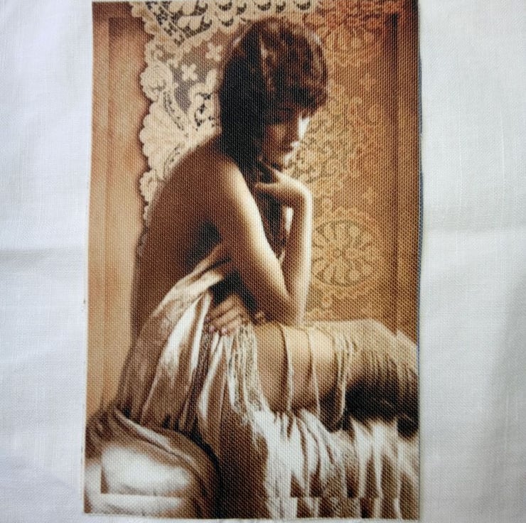 The panel measures 10x15cm and is professionally printed on to 250gsm soft canvas. The image is of a beautiful lady, I'd say from around the 1910's draped in a shawl on a lace background. Colours range from white, sepia, peach and brown.