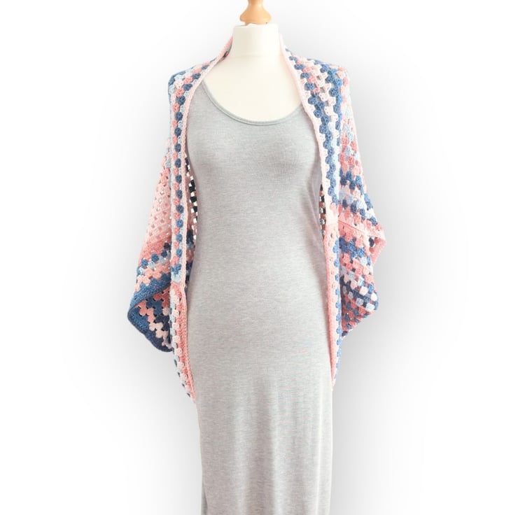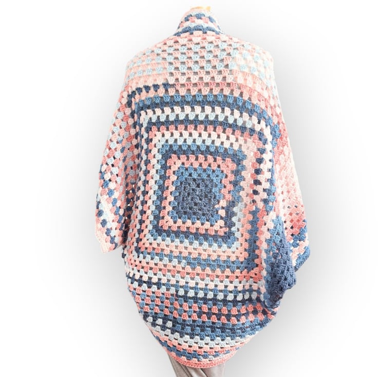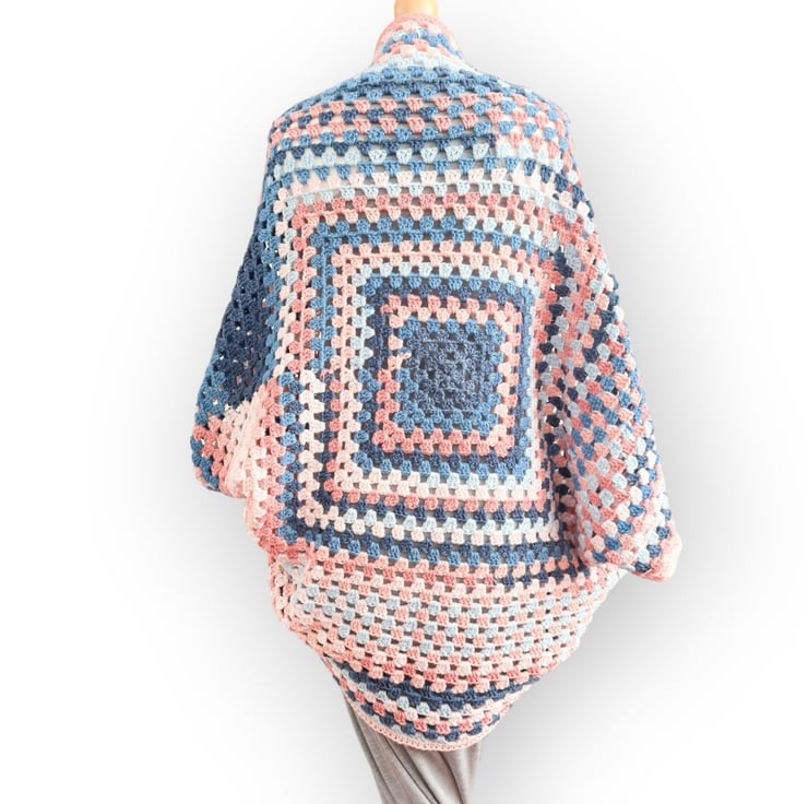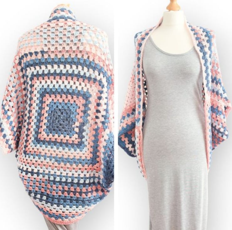 Add a pop of colour and boho flair to your wardrobe with this unique cocoon shrug cardigan, made from one giant granny square folded in half and sewn down the sides, leaving room for armholes.