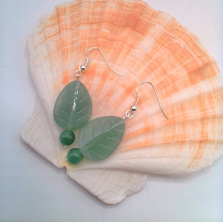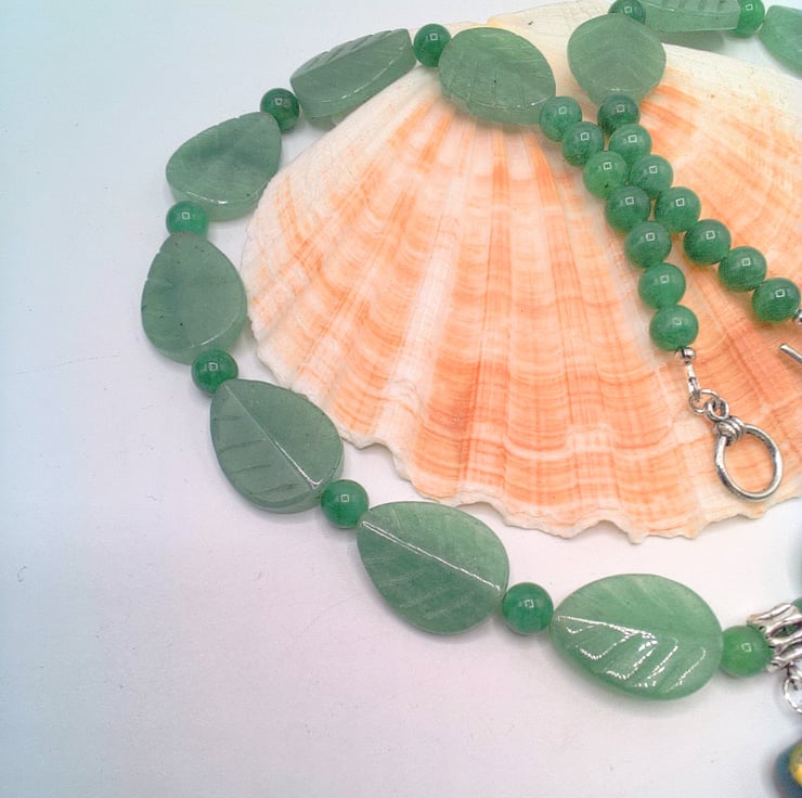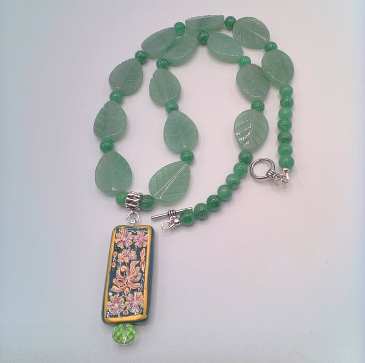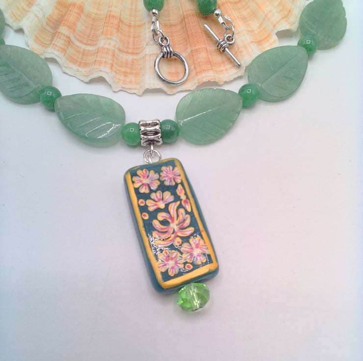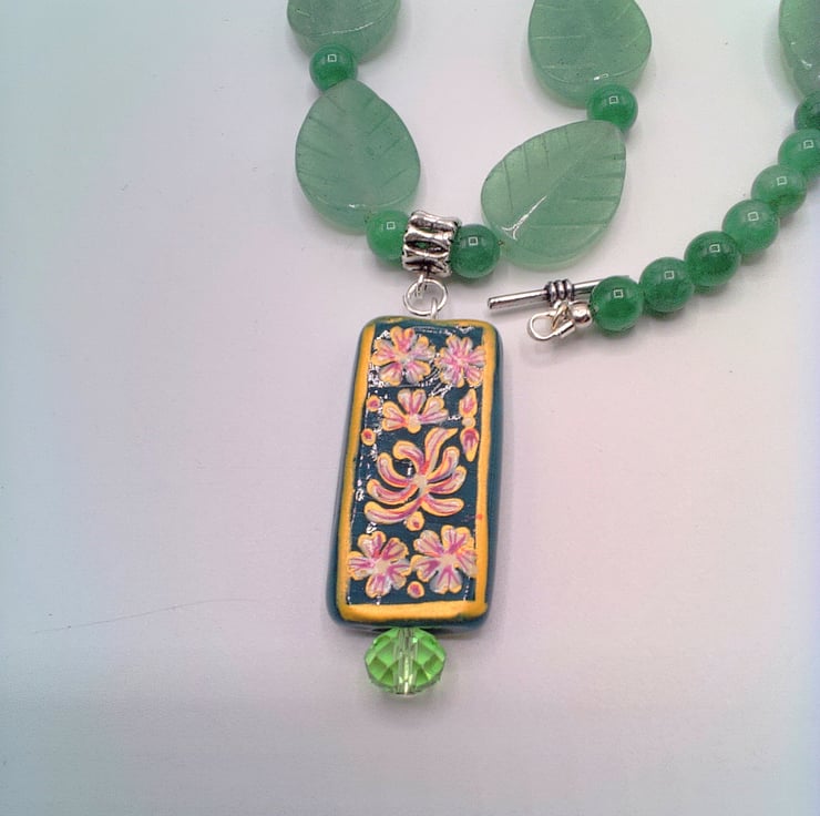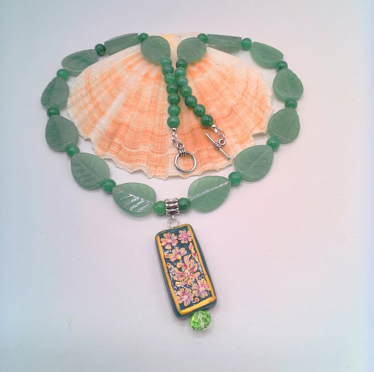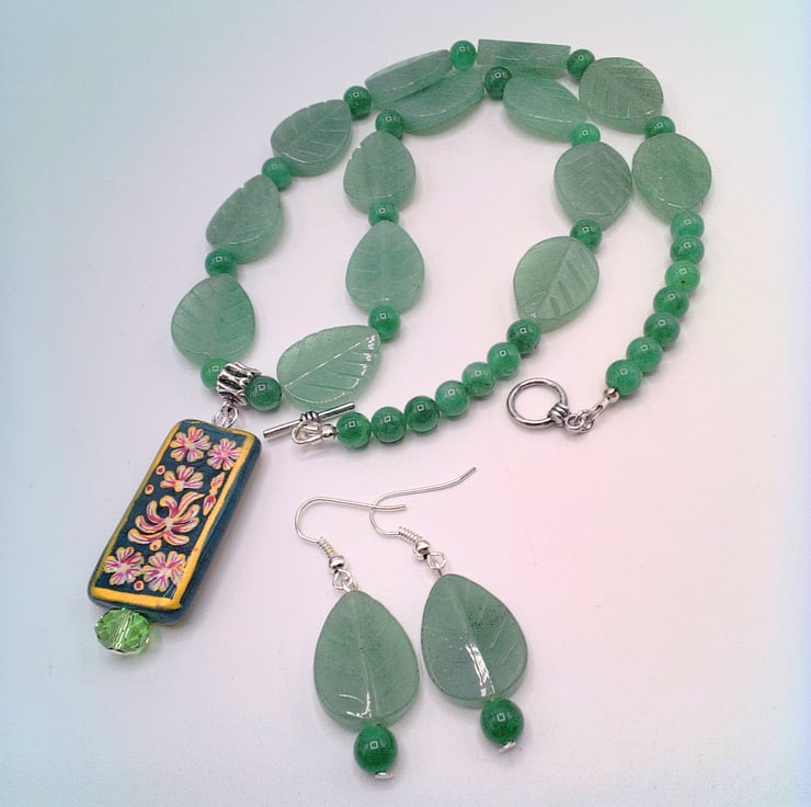This very pretty necklace and earrings set would go well with any outfit you wear everyday or for a casual evening out. It would make a lovely gift for a friend or relative for a birthday, Christmas or anniversary or a nice treat for yourself. The pendant is made with a 35 x 15 mm green rectangular glass bead, with a painted flowers pattern, and an 8 x 6 mm pale green crystal rondelle suspended on a bail on a necklace of green 20 mm x 15 mm glass leaves beads and 6 mm round green beads. The necklace is fastened with a silver plated toggle clasp. The earrings use one of the leaf beads and a round bead suspended on silver plated hook ear wires. The necklace is 19 inches (48.25 cm) in length, with a drop of 2 inches from the base of the bail for the pendant, and the earrings have a drop of 1.25 inches (3 cm) from the base of the ear wire. The necklace will be dispatched wrapped in tissue paper in an organza bag and delivered to you via Royal Mail first class post.