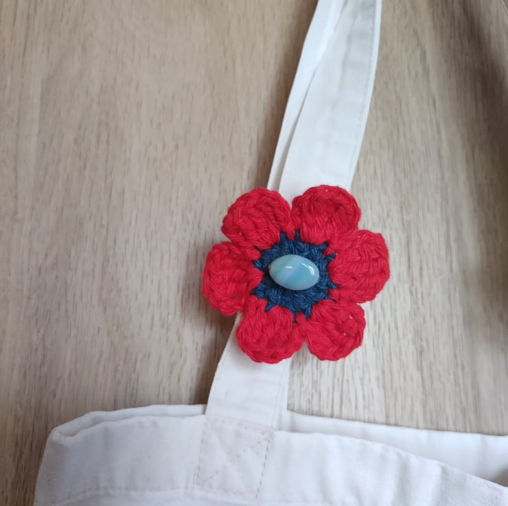 Crochet Flower Brooch with embroidered Czech oval glass bead.
