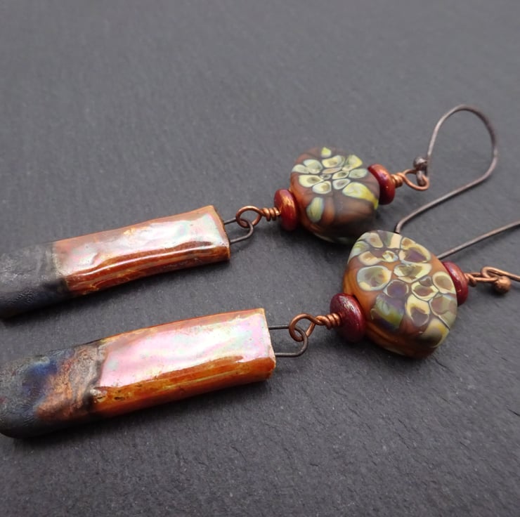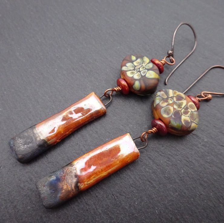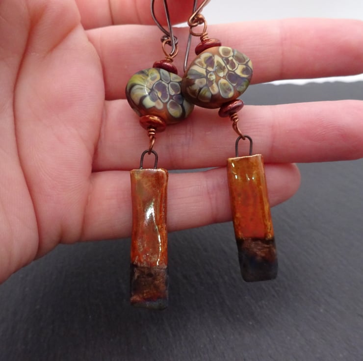 A pair of earrings made with handmade copper ear wires, handmade brown lampwork glass beads and handmade ceramic stick charms.
