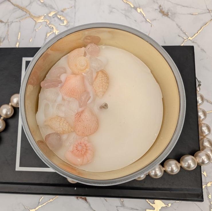 Indulge in the elegance of our Grace Luxury Candle. This stunning candle, housed in a white Italian container with a gleaming gold interior, is hand decorated with shells, mica dust, and crystals, creating a truly unique piece.