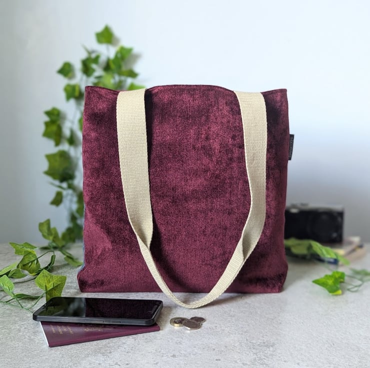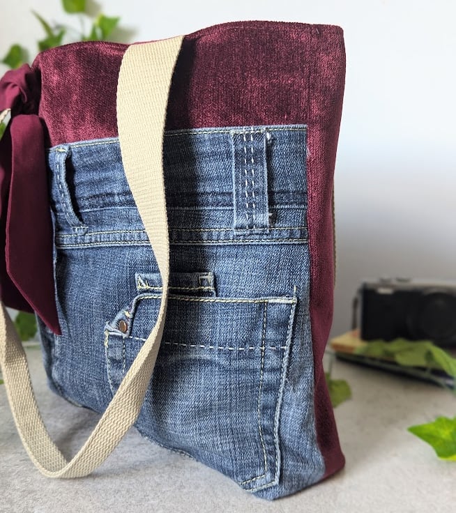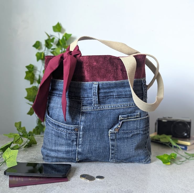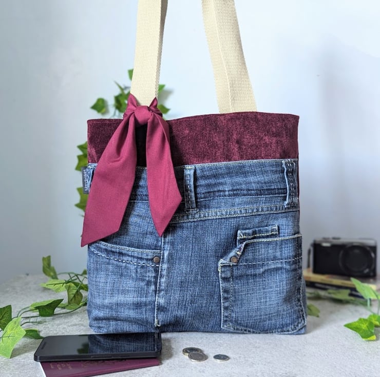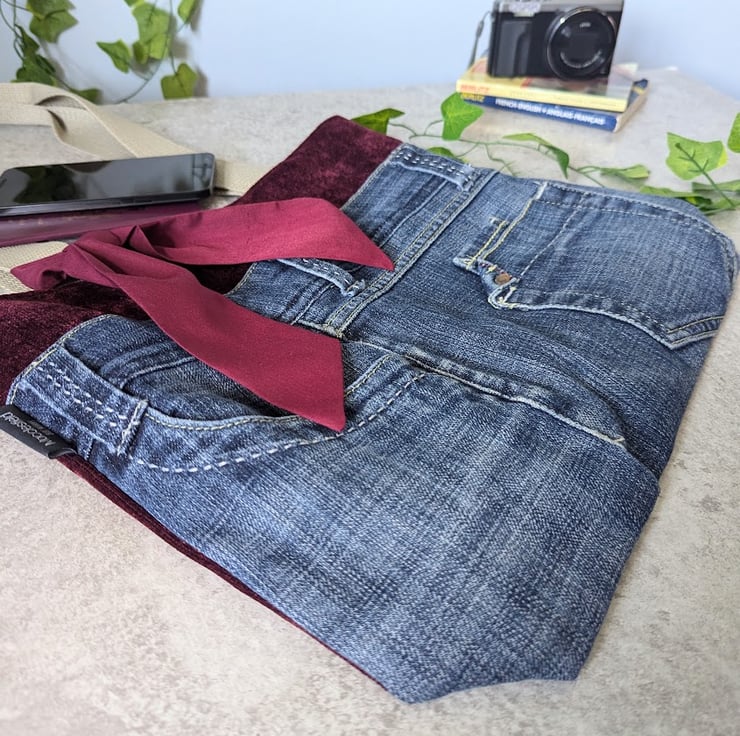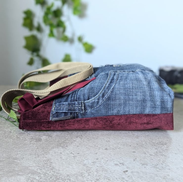 This stylish grab tote bag has been handmade using recycled, denim jeans and a deep burgundy chenille upholstery fabric. It has a burgundy polyester cotton lining and light khaki grab handles. A matching, removable tie decorates the front of the bag.