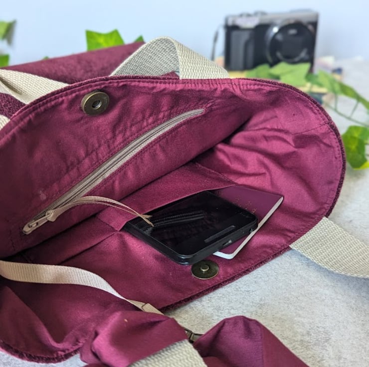 The bag is slouchy and light to wear but designed to be sturdy enough for everyday use. On the outside are two usable jeans pockets from the original jeans, inside there is a slip pocket which suitable for phone, pens etc and a deep zipped pocket for added security. For those of us who lose our keys in the bottom of our bag, there's a swivel lobster clasp secured to the inside of the bag with a grosgrain ribbon. The opening is secured with a bronze coloured magnetic closure.