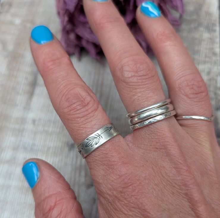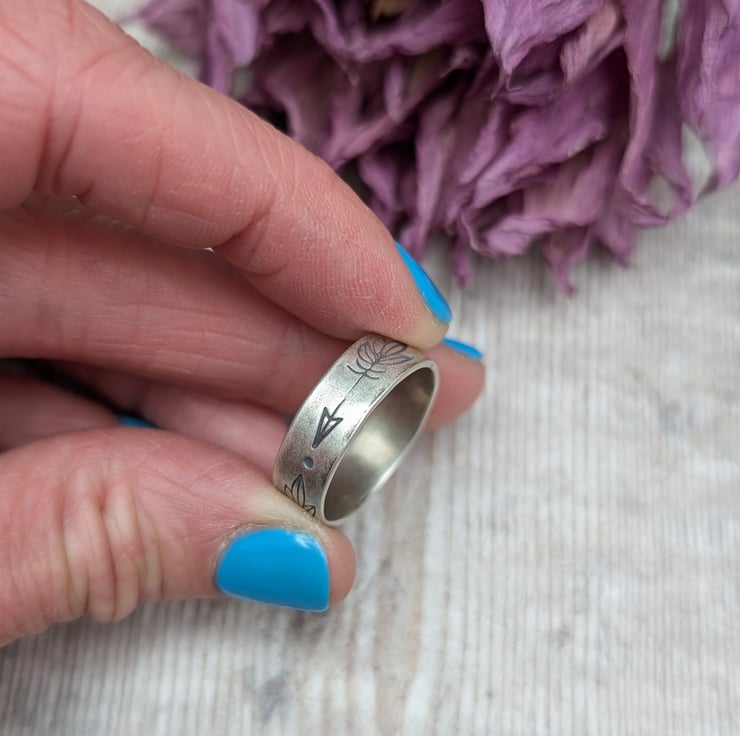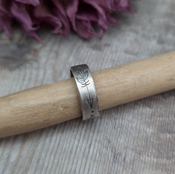 This handmade ring, created from recycled silver, features a delicate feather design stamped along its surface. The subtle, nature-inspired motif adds a unique and personal touch, symbolising freedom and resilience. With a soft matte finish, this ring has an understated elegance that makes it perfect for everyday wear or as a meaningful accessory to cherish.