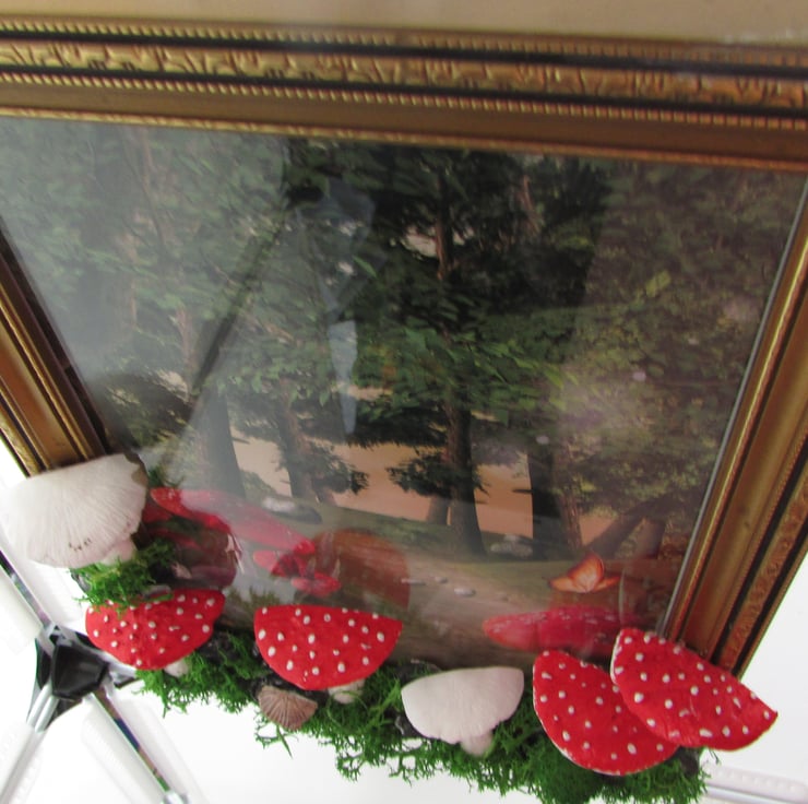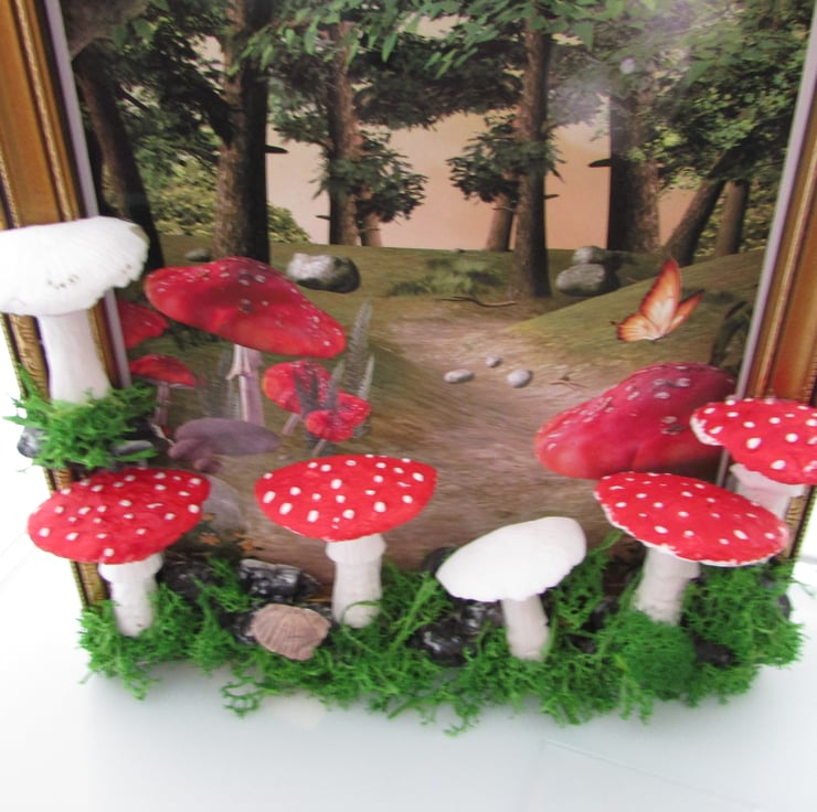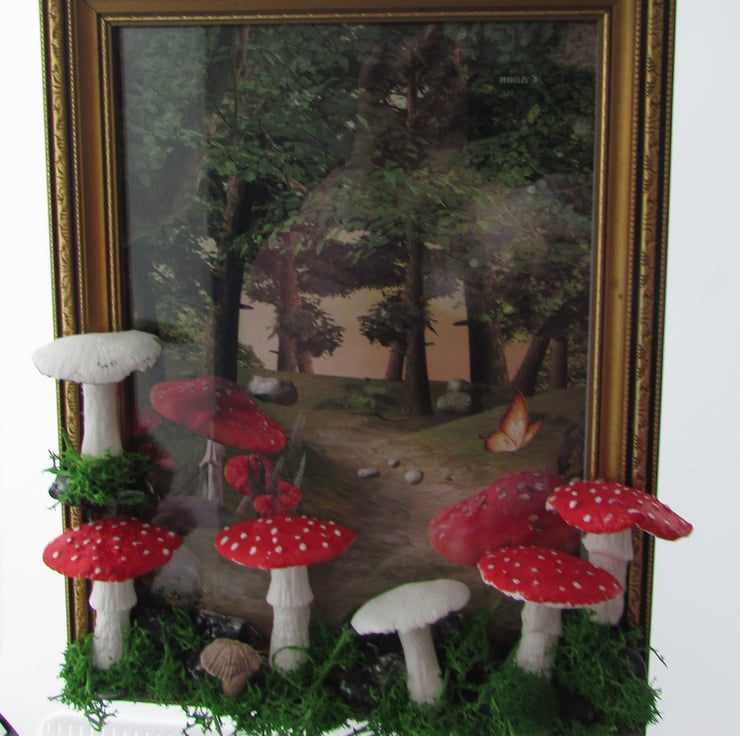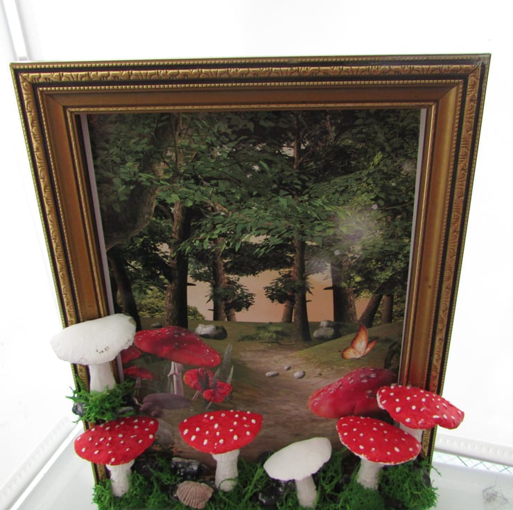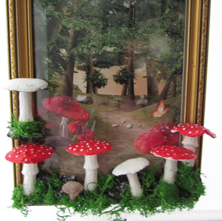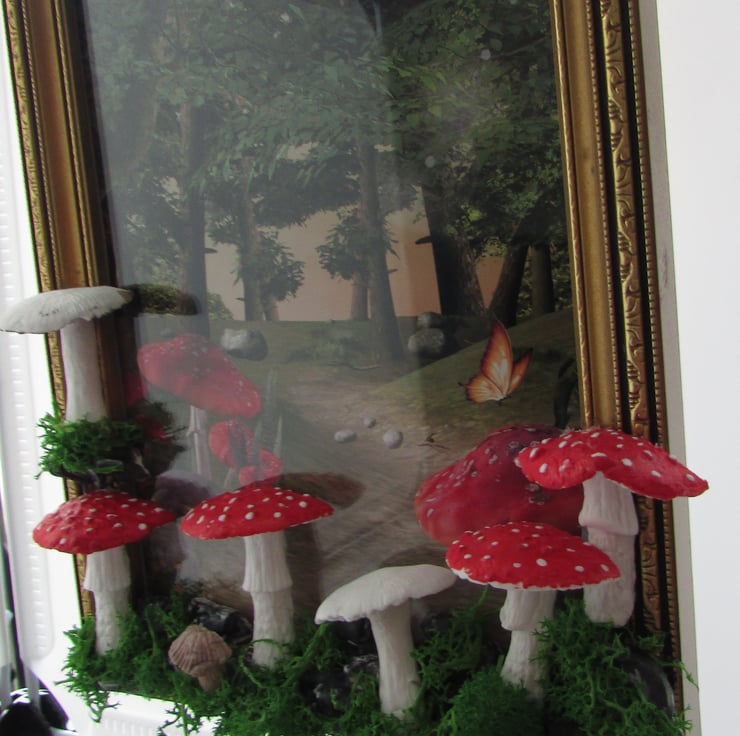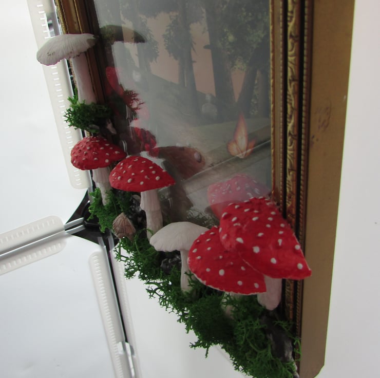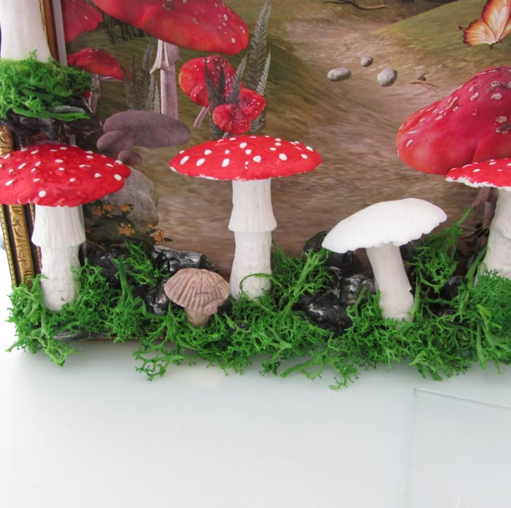 the wooden golden picture frame with a woodland print then hand sculpt the tree around the picture frame with a woodland print and mushroom, moss using air drying clay mushroom, and moss. I take time deciding where each piece will belong to make it perfect. stones, mushroom, moss, then paint and varnish the pieces i crafted for a glossy look.