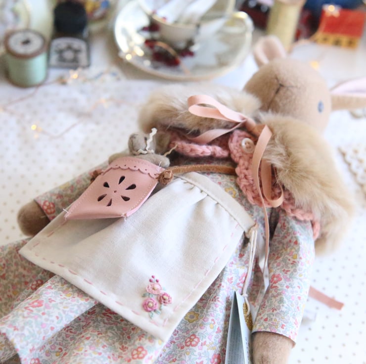 Her accessories include a tiny leather bag, hand punched with a daisy design and containing a baby bunny with a ric rac tie.