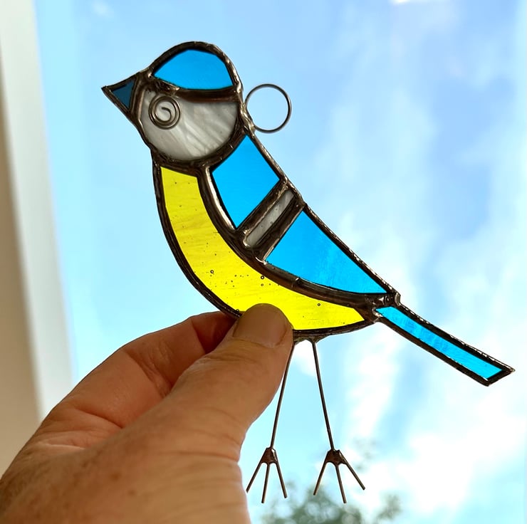 Blue tit suncatcher made from beautiful stained glass by Carole’s Glass.