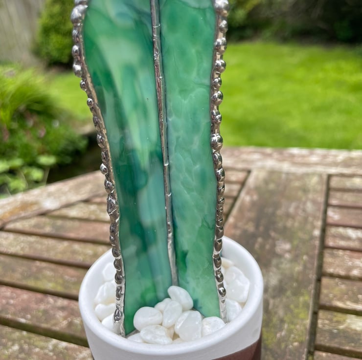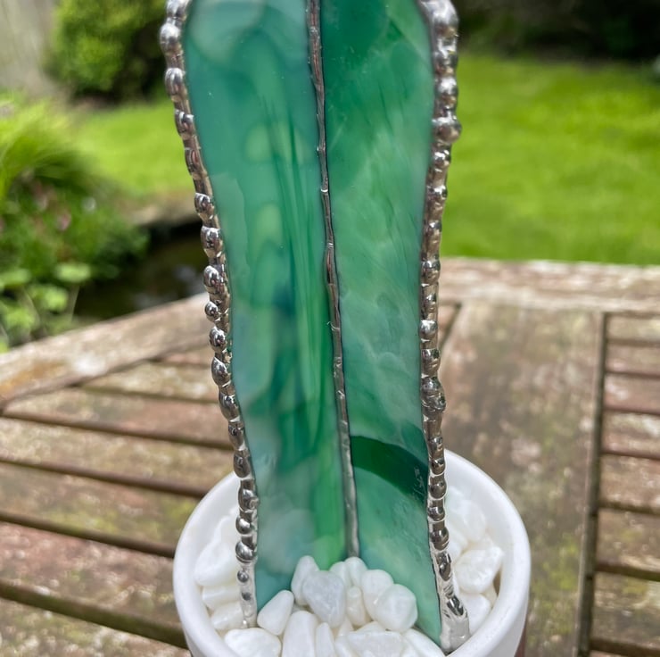 A great combination of a stained glass in a decorative pot. No need to water, it will always look great! Place on your desktop or send it as a gift. This glass is opaque and has a totally unique pattern which happens during the production of this beautiful speciality glass. The tall cactus is created using the technique used by Tiffany. Each piece of glass is handcrafted and goes through a series of processes. The glass cactus is set in a small pot and topped with white gravel.