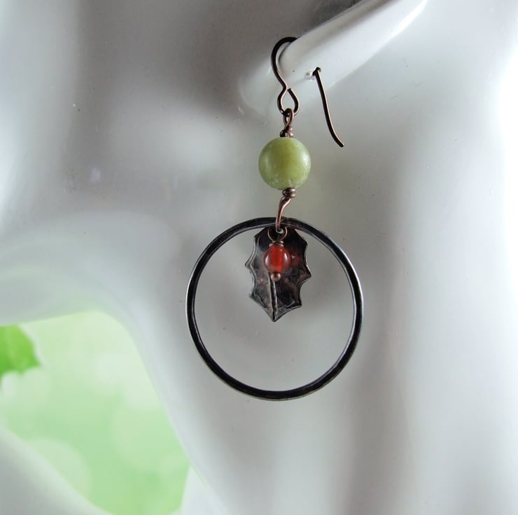Festive Earrings. Copper Holly Leaf in hoops with little carnelian berry beads and jade with hypoallergenic niobium ear wires.
