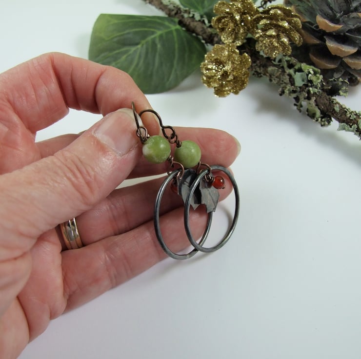 Copper holly leaf shapes have been cut from copper sheet, drilled and textured to create the leaf markings. These are suspended inside copper hoops made from 1.5mm copper wire and paired with some little red carnelian gemstone beads and green jade beads. Fitted to hypoallergenic niobium ear wires.