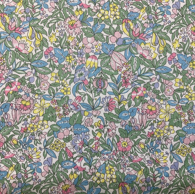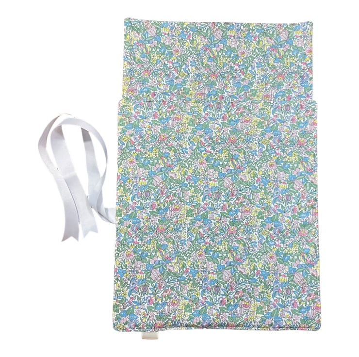 The case is in a Pretty Liberty Lasenby cotton floral print ‘Hyde Floral’ in shades of pink, lemon, lilac and blue with green foliage on an off white background, paired with Heavyweight turquoise blue canvas cotton.