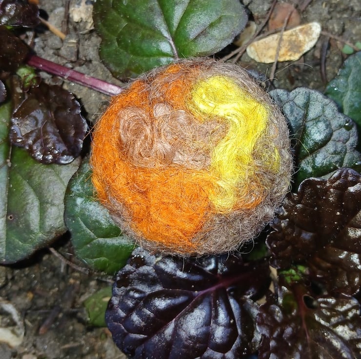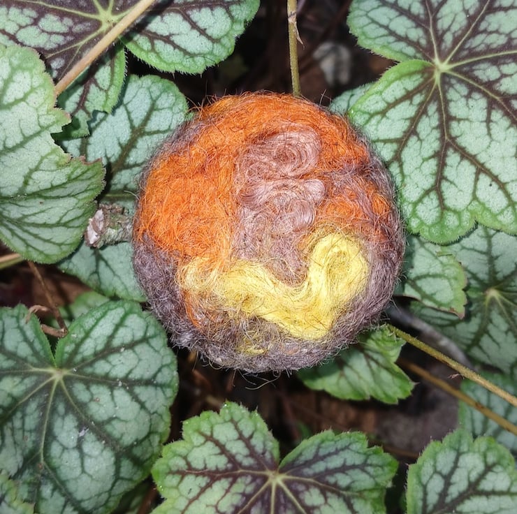 A circular needle felted brooch made with Gotland fleece. This is hand dyed in shades of brown, orange and yellow.