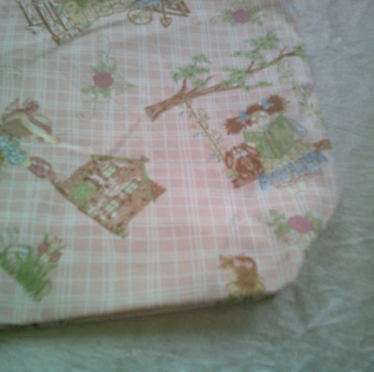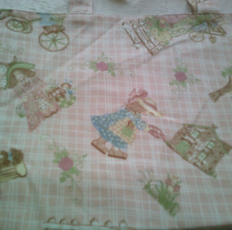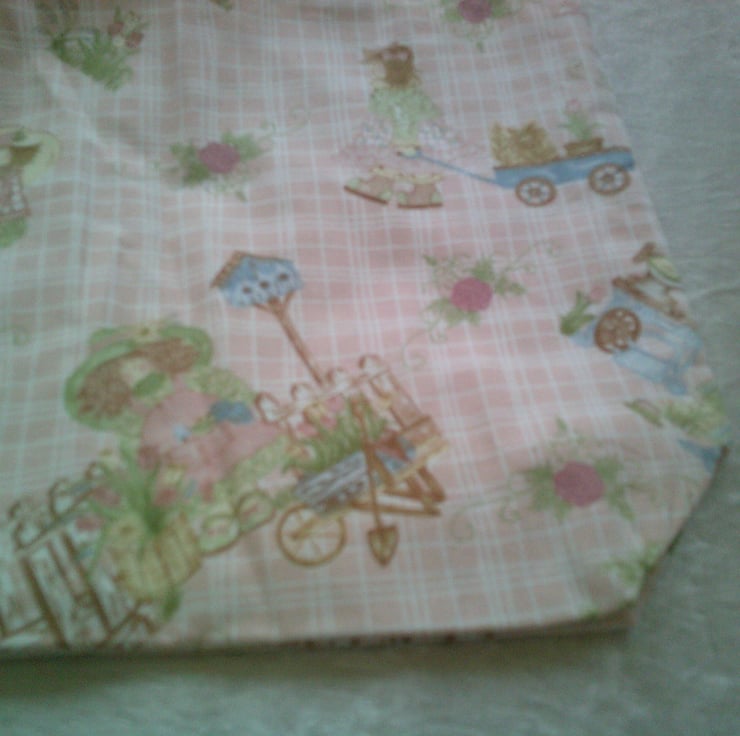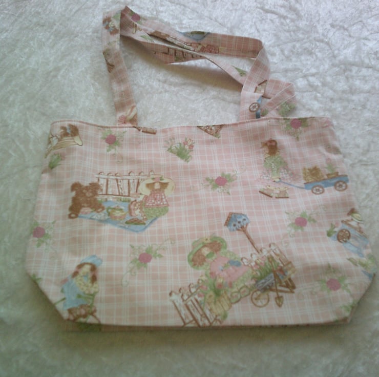 This Eco Friendly, fabric bag is made using 100% Cotton and features dolls and garden scenes on a pale pink background. It is fully lined and machine washable.