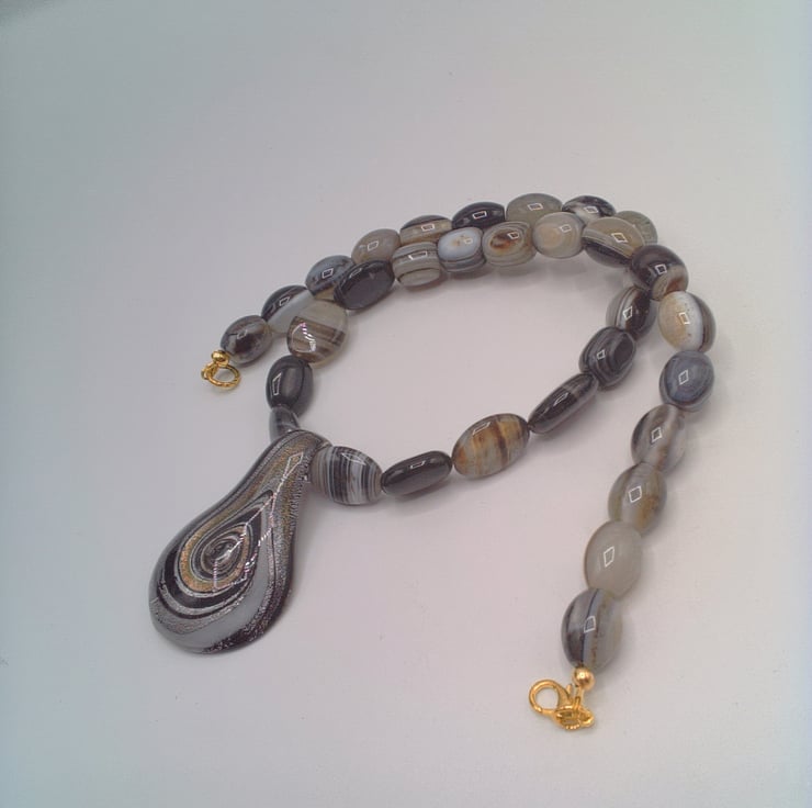 This gorgeous necklace would go well with any outfit that you wear everyday or for a casual evening out. It would make a lovely gift for a friend or relative for a birthday, an anniversary, or a lovely treat for yourself. A beautiful black glass pear drop shaped pendant necklace, with black, gold, silver and grey swirls is threaded onto a beaded necklace of 12 mm x 10 mm barrel shaped black, grey and white agate beads and 18 mm x 12 mm black grey and white oval agate beads. The necklace is fastened with a gold plated lobster clasp. The overall length of the necklace is 18.5 inches (47 cm) with a drop of 55 mm from the necklace for the pendant. The necklace will be dispatched wrapped in tissue paper in an organza bag and delivered to you via Royal Mail first class post.