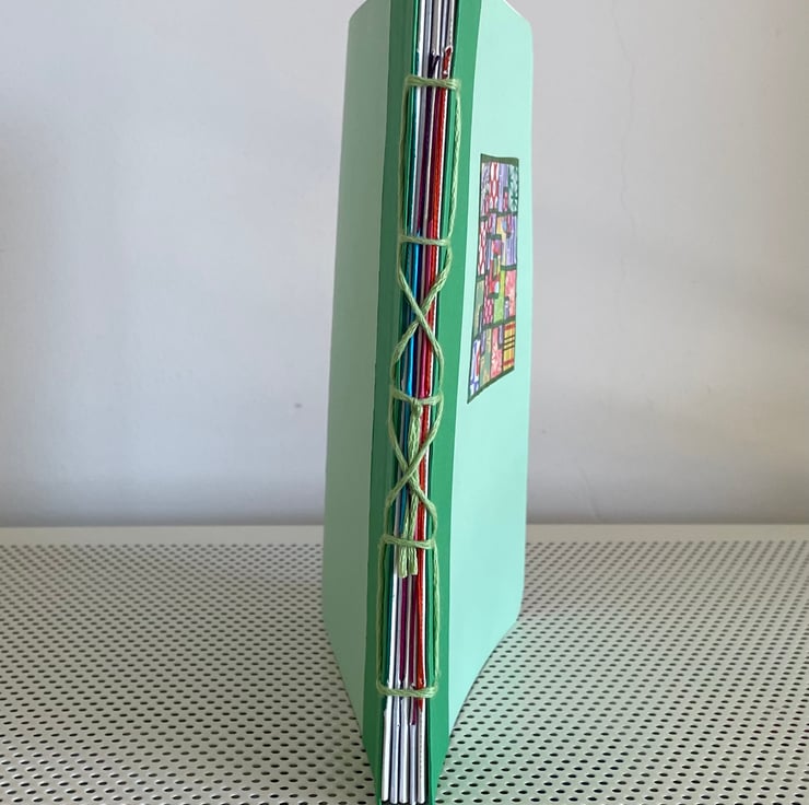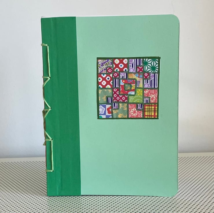 The paper and cover corners are rounded and the cover is decorated with a hand pieced collage motif using plain and hand patterned paper.