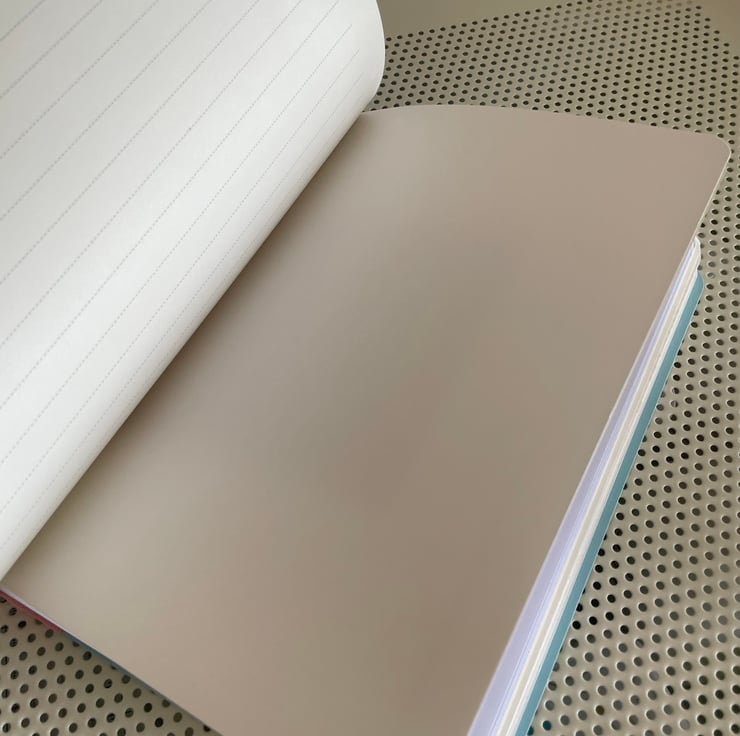 Approximately A5 sized this notebook has been designed as a project workbook to assist the user in planning,designing and recording their projects. It has five hand stitched book blocks three alternating lined and plain pages and two alternating graph and plain pages. Plain paper for drawing, lined paper for notes and graph paper for technical details. In addition there are two small hand folded envelopes secured in the binding to hold loose materials e.g. fabric swatches, templates etc.