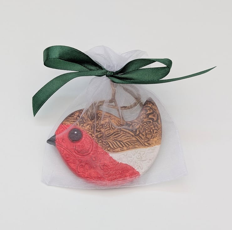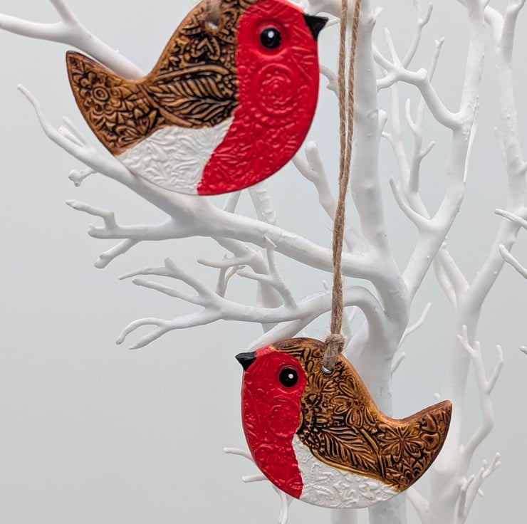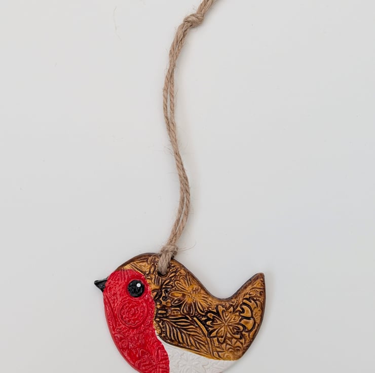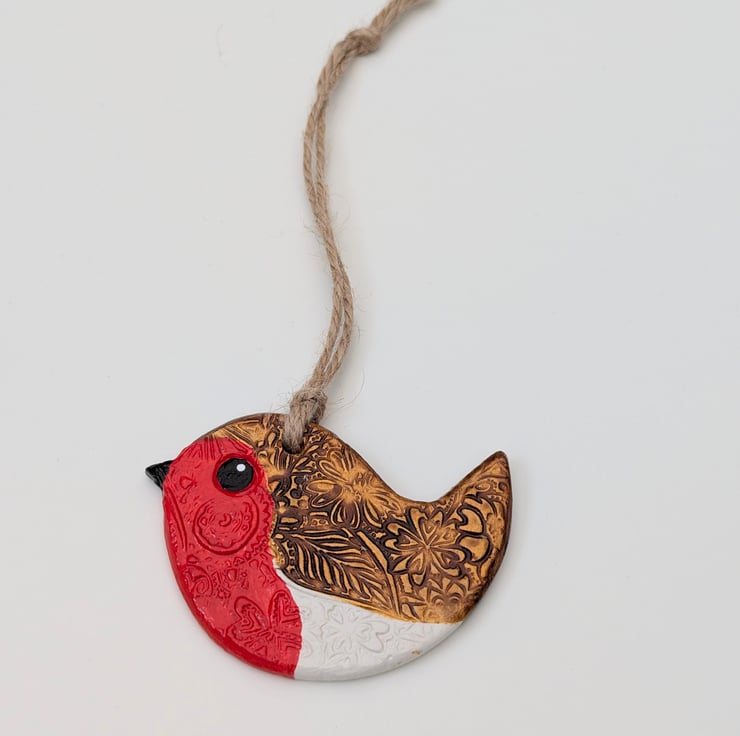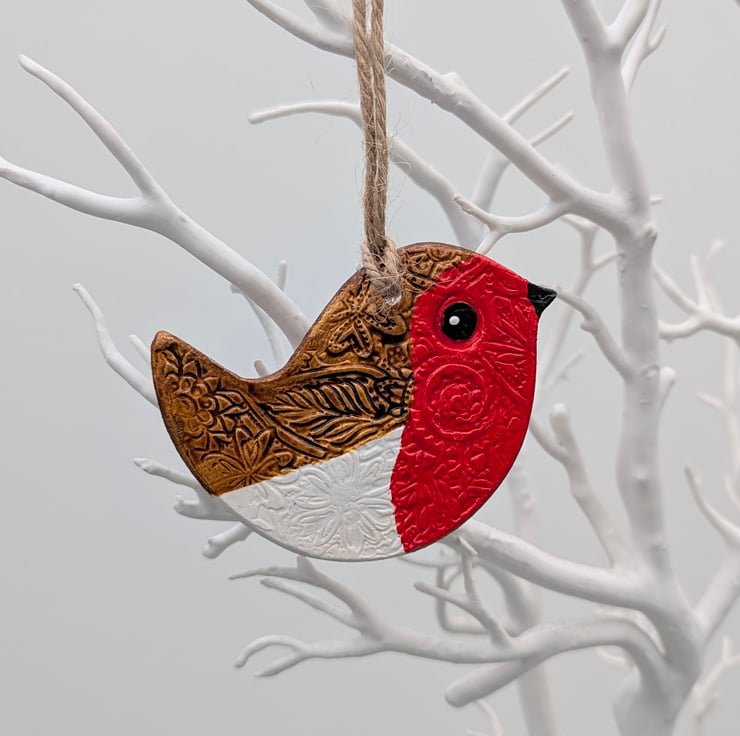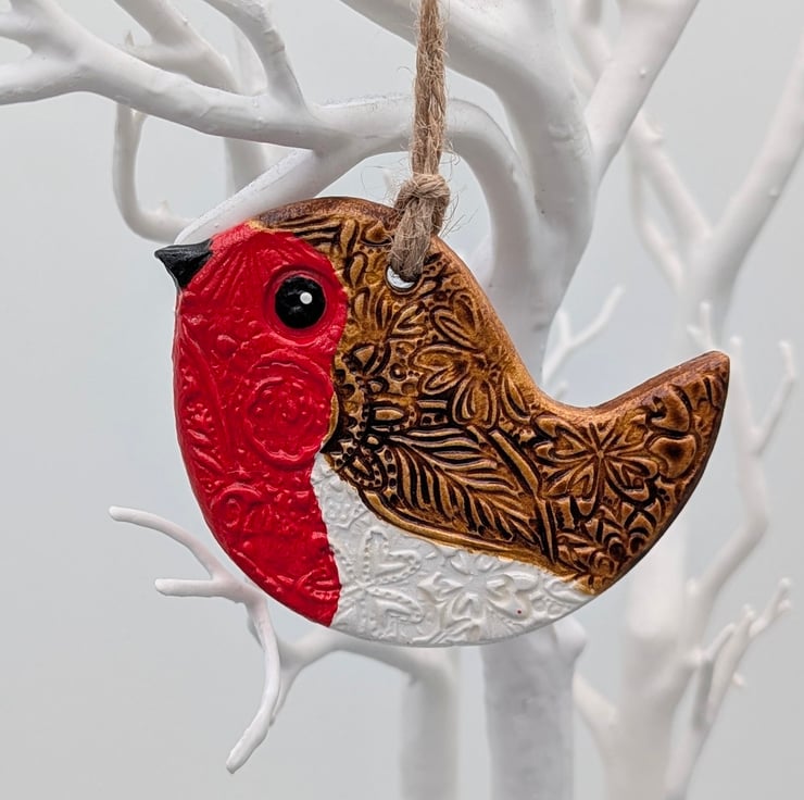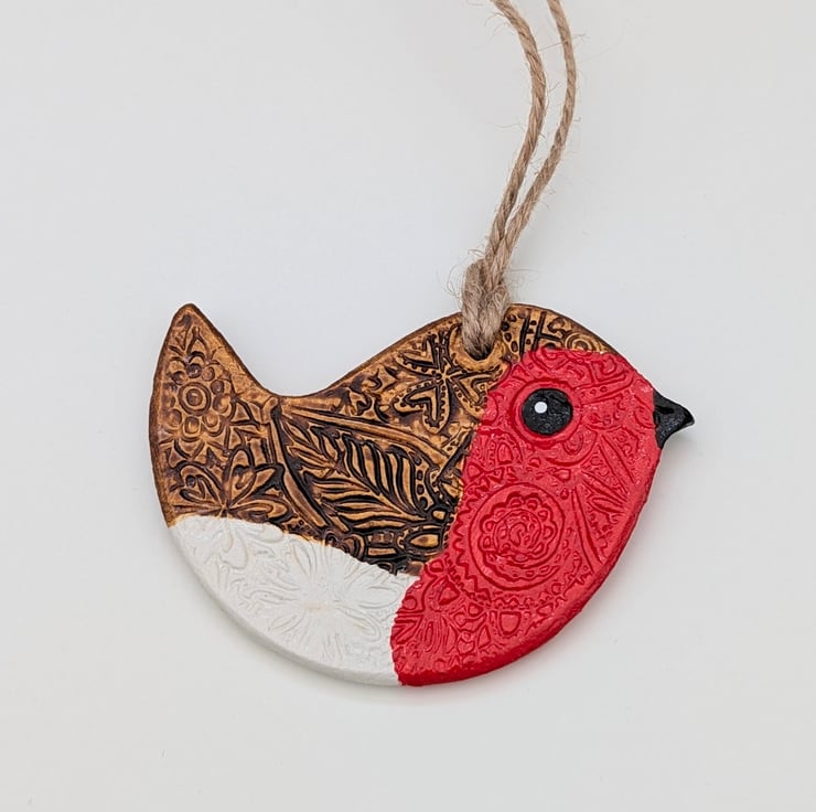 Beautiful clay robin hanging decoration. This lovely bright robin redbreast has been lovingly handmade from air dry clay, embossed with a floral pattern, gently sanded and painted with acrylics and a coat of interior varnish. Both sides of the bird have been decorated so it can be hung left or right facing and would look perfect displayed in a window, on a Christmas tree, from a handle or attached to a gift bag.