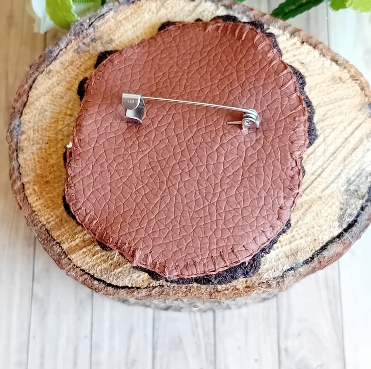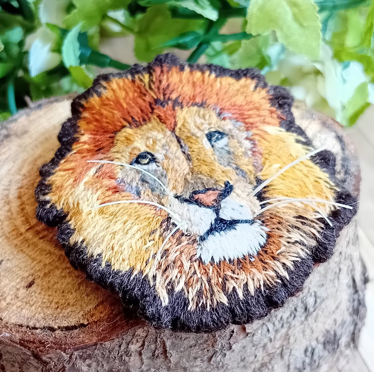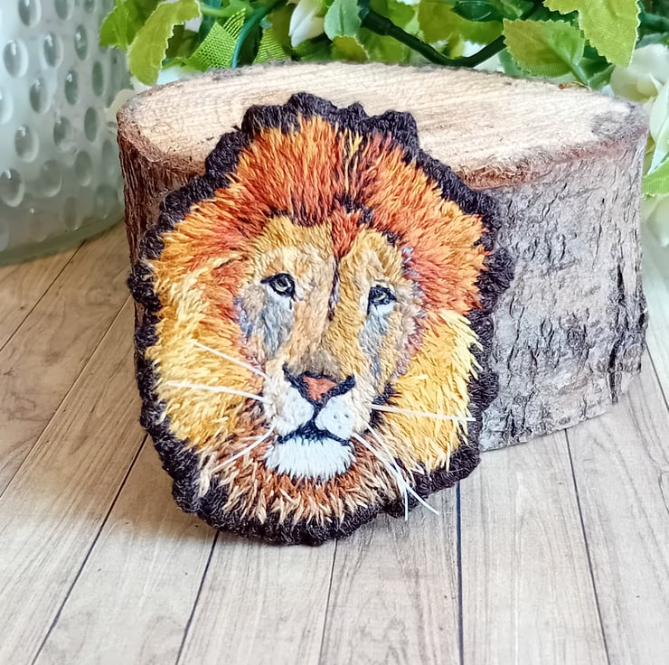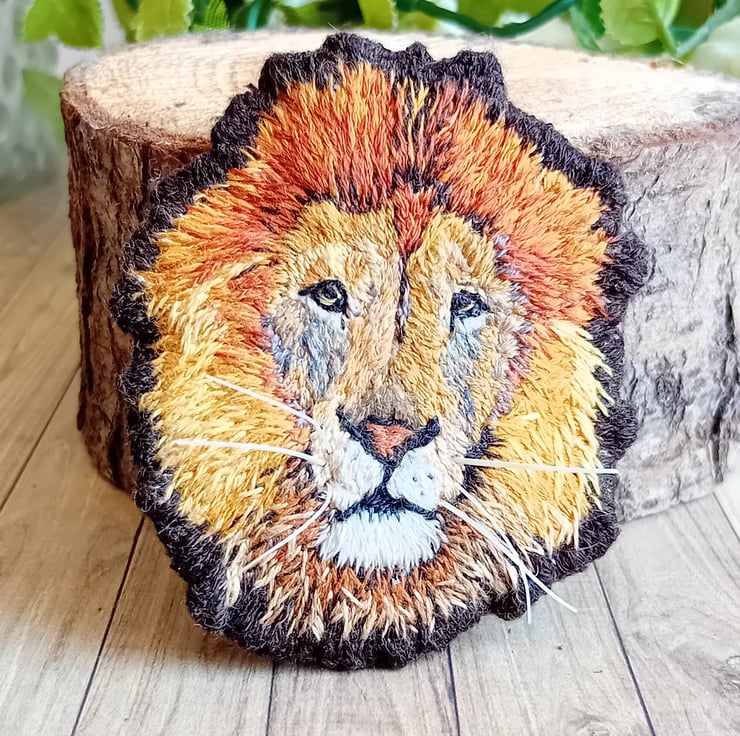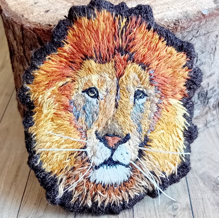 This highly detailed Lion head brooch has been hand embroidered using coloured thread. His whiskers are made with faux feathers and backed with faux leather. A stainless clasp attached also.