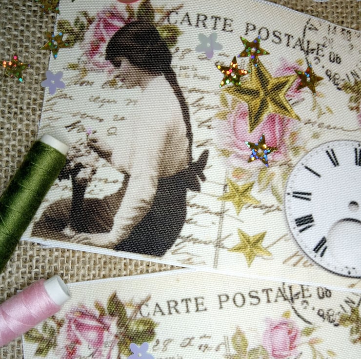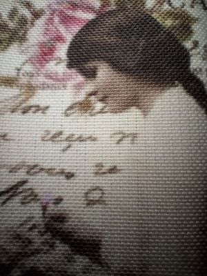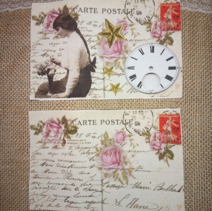This listing is for 2 fabric panels, measuring 10x15cm each. One panel is plain, it shows a postcard with beautiful hand writing on it and gorgeous pink roses. The 2nd panel shows the profile of a young Edwardian lady holding a rosebud, next to a vase of roses. I have also added star elements in varied sizes.
