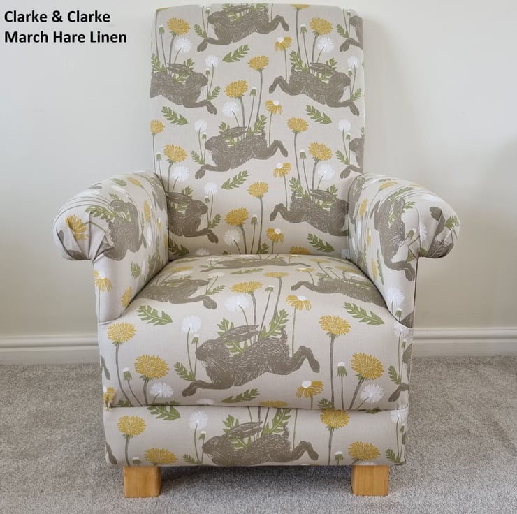 This is a sturdy, full assembled ADULT'S chair, which has been made myself. I am a professional upholsterer with over 33 year’s experience, and have made this charming little armchair using Clarke & Clarke March Hares Linen Ochre fabric.